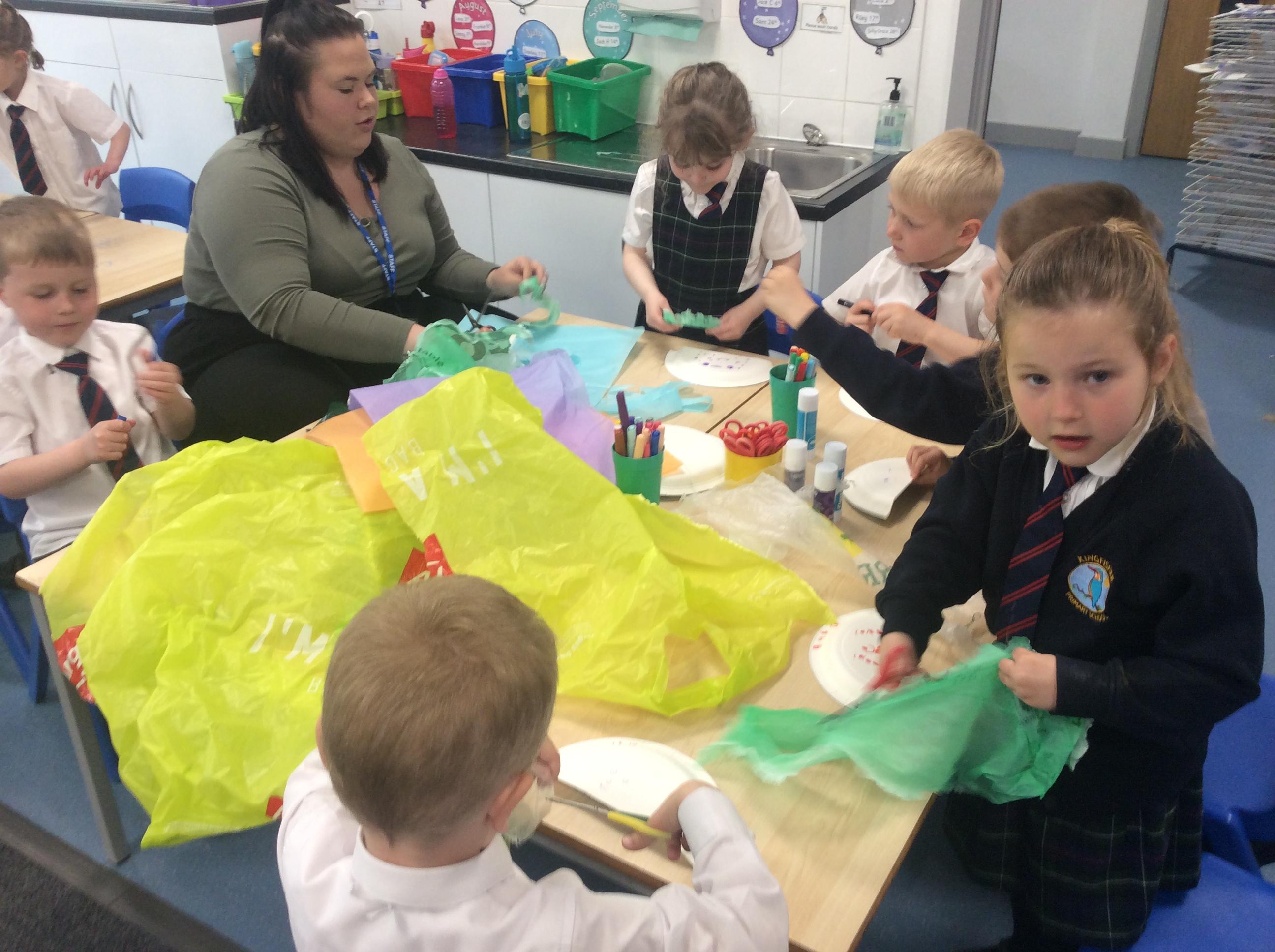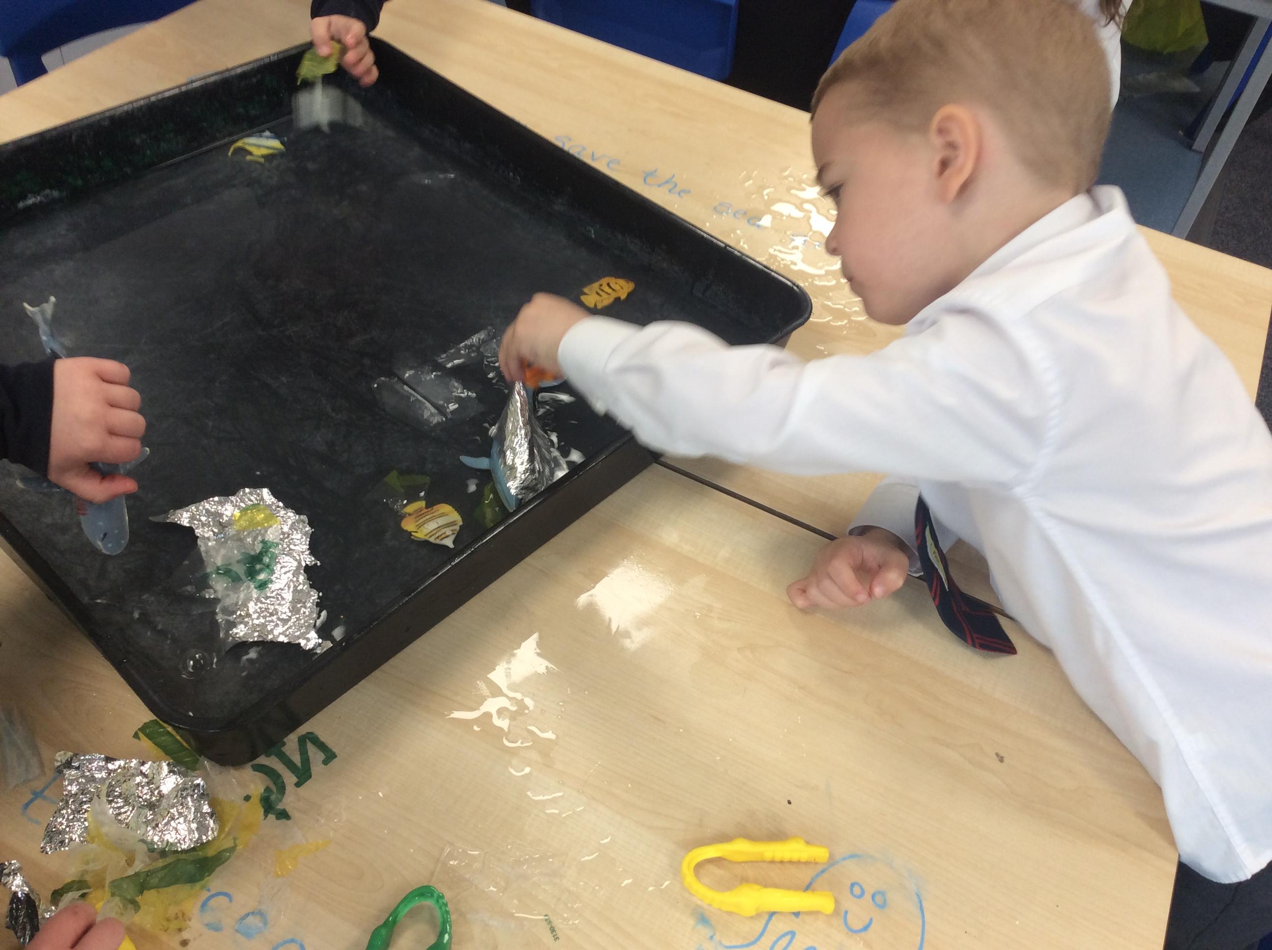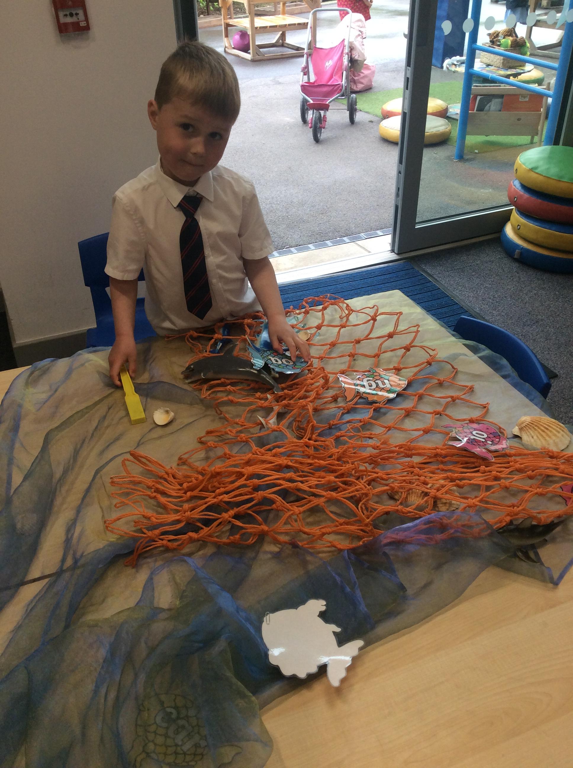 On Monday 22nd April we celebrated Earth Day. We spent the afternoon learning all about how we could help our planet. We focussed on plastics in the ocean and enjoyed reading and discussing the story 'Someone Swallowed Stanley', about a plastic bag who ends up being eaten by a turtle who thinks it is a jelly fish. Then we carried out some activities including using plastic bags to make jelly fish, cleaning up the plastic from the water tray and rescuing the animals from the net.