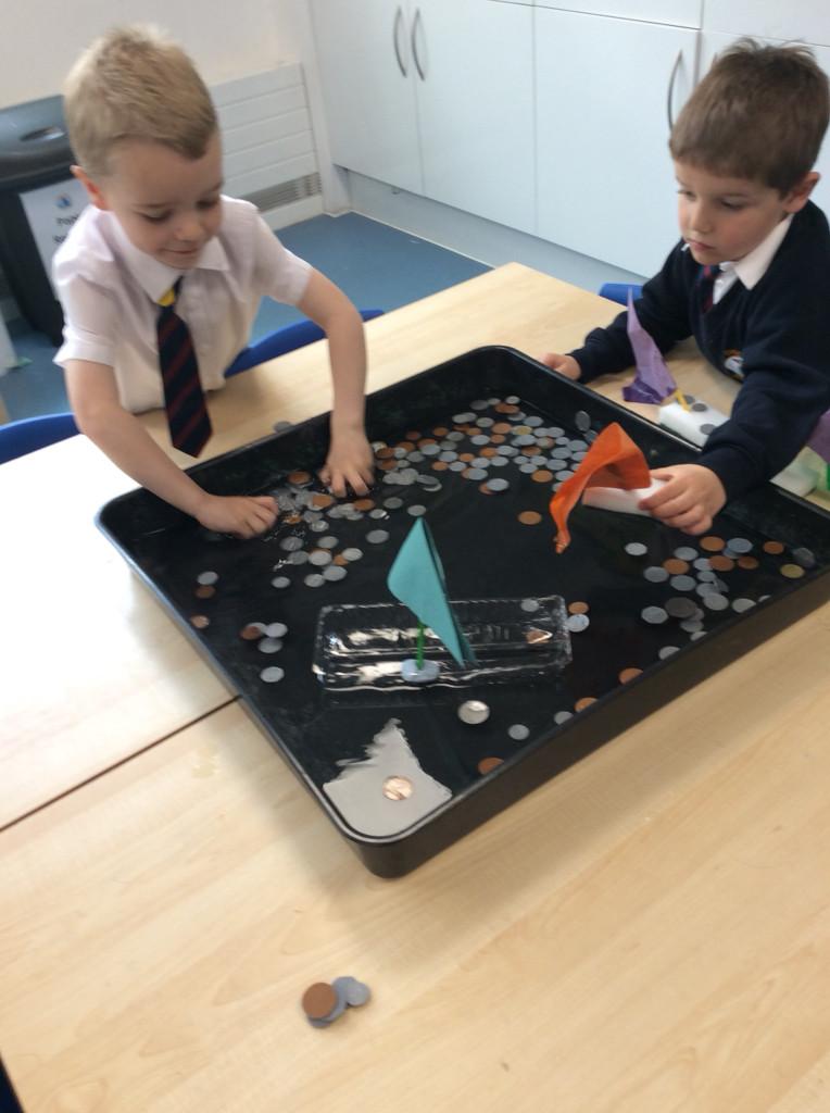 The children loved using the different materials to make boats. We talked lots about the features of a boat including it needing to be waterproof and to be able to float. After the children had made their boats they then got to test them in the water and see how much treasure they could carry.