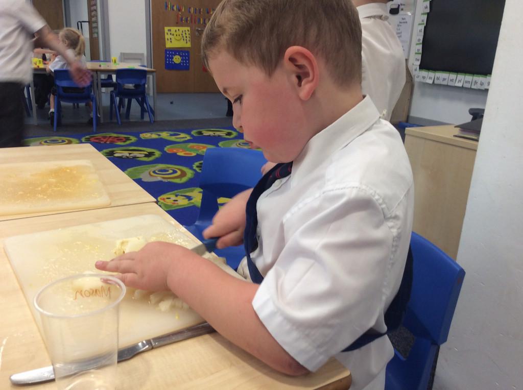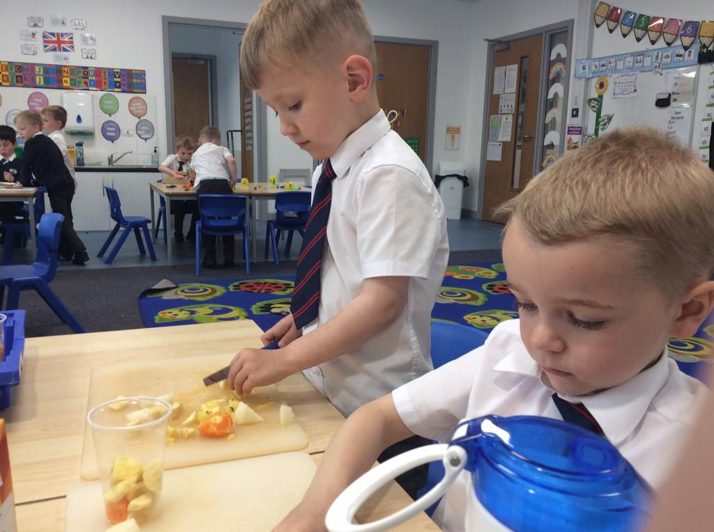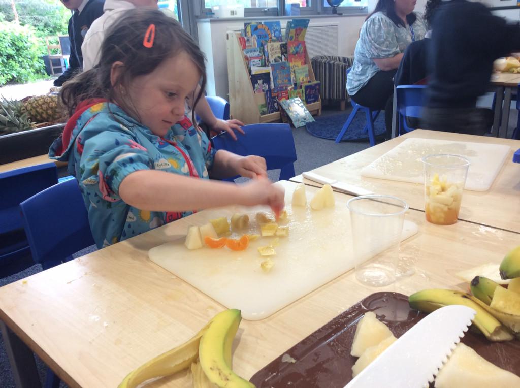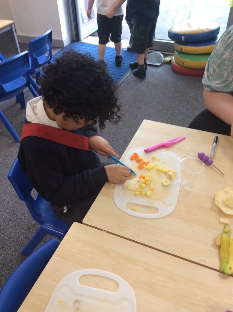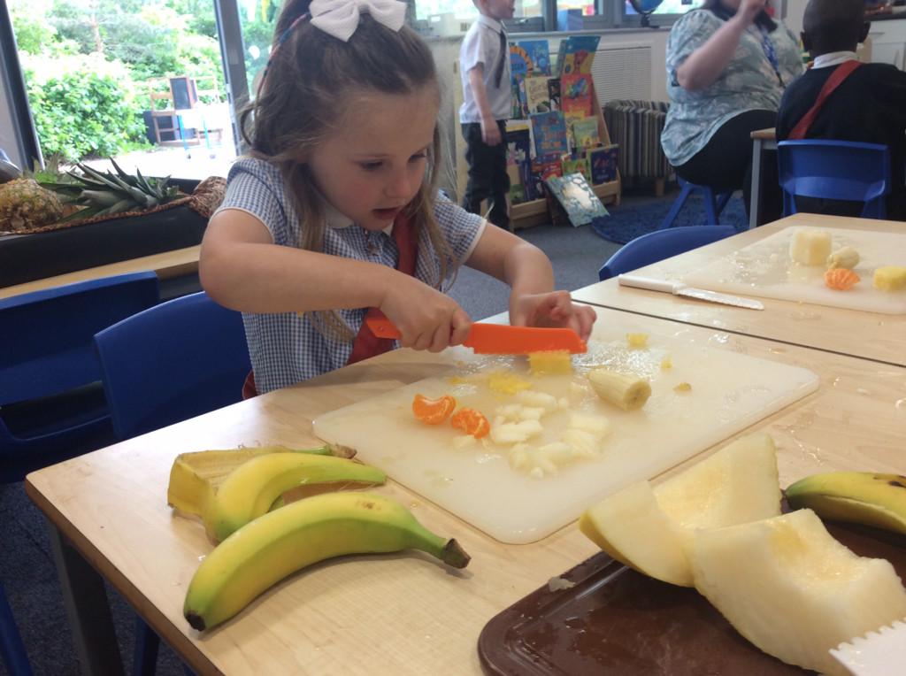 As part of our learning based on the story Handa's Surprise we made fruit salad using tropical fruits. The children demonstrated their cutting skills to cut up bits of fruit to make their salad and then enjoyed having it for their afternoon snack.