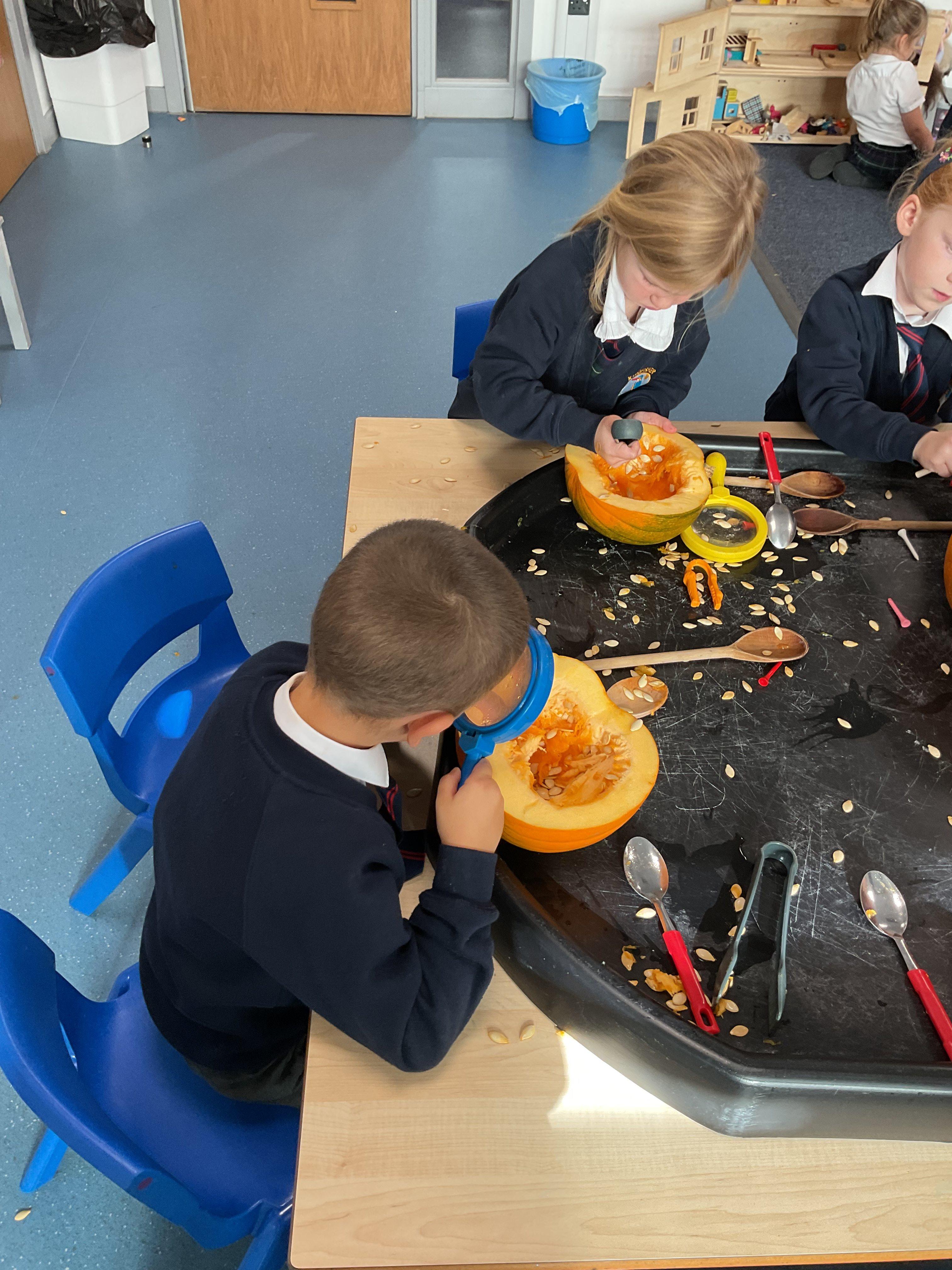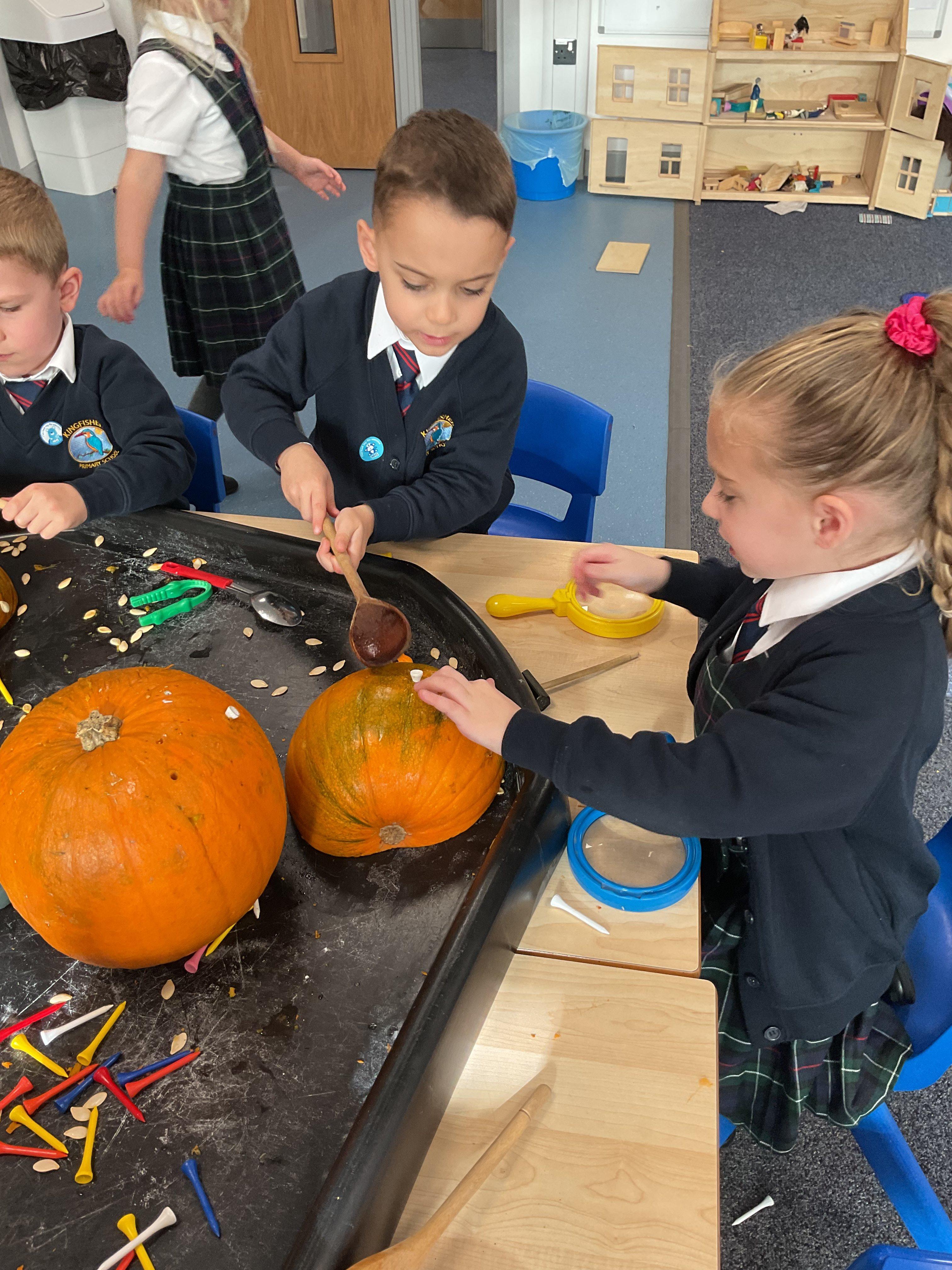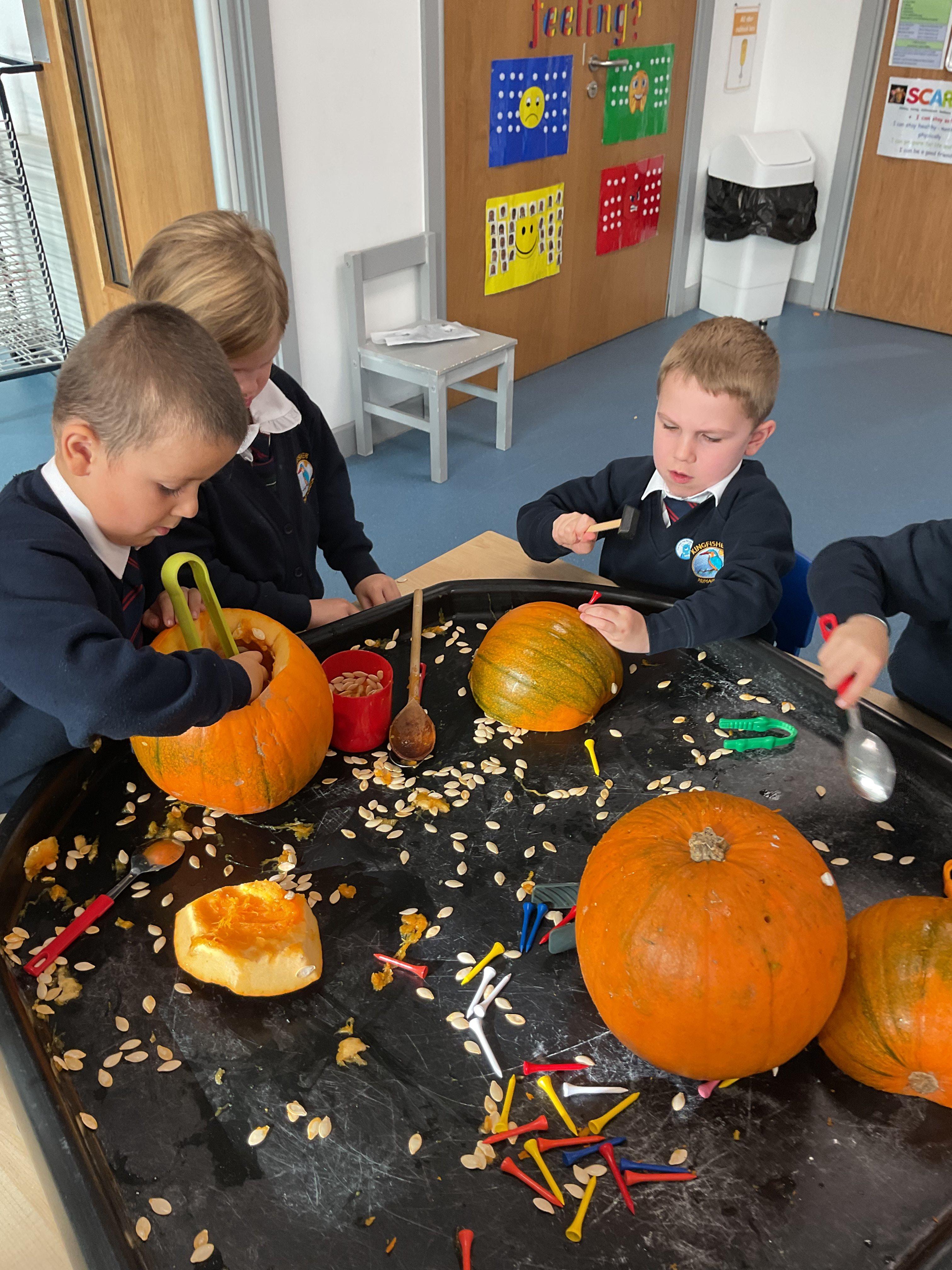 As part of our Halloween topic the children had lots of fun getting messy and exploring pumpkins. They were exploring the seeds and the flesh using different tools and materials as well as developing their fine motor skills by hammering golf tees into the skin.