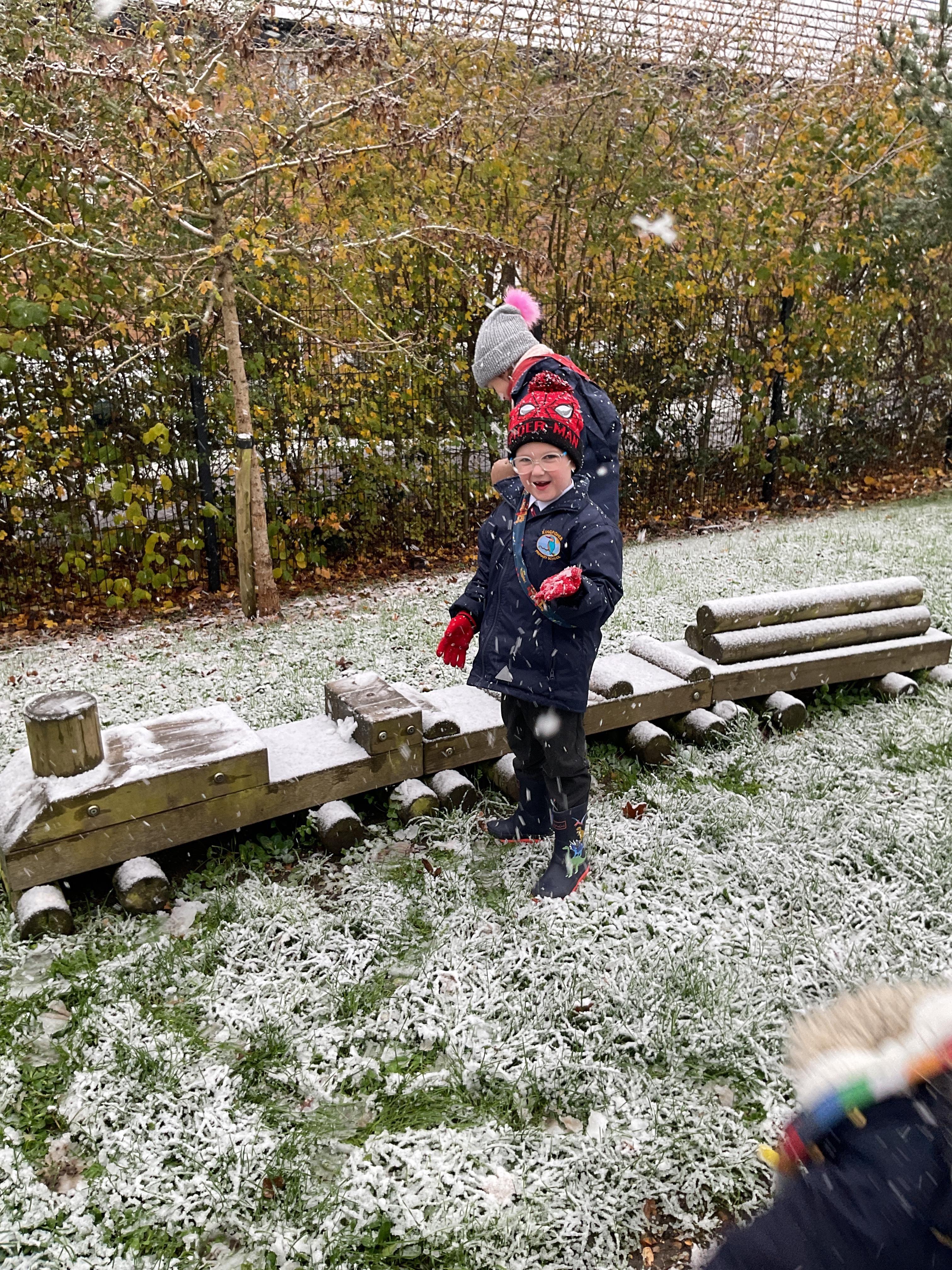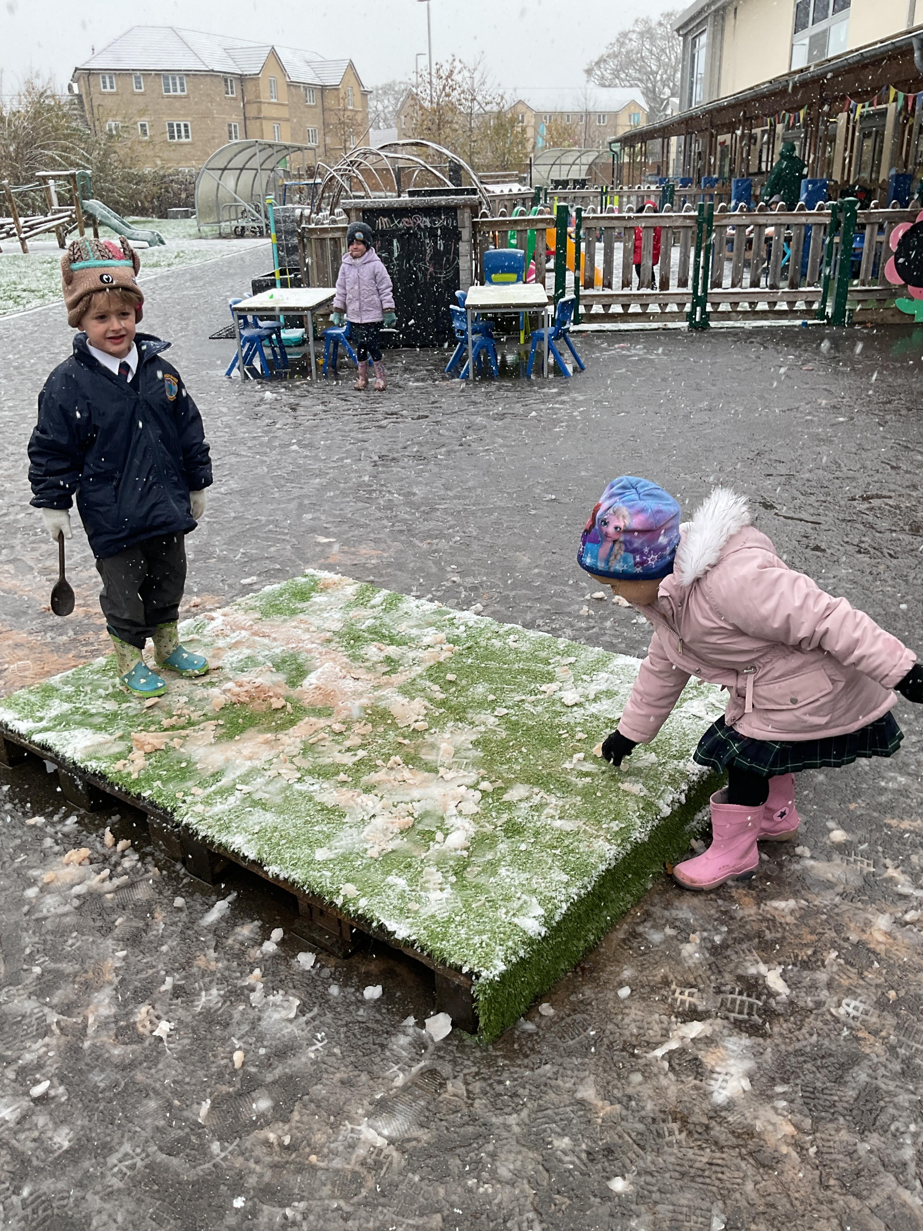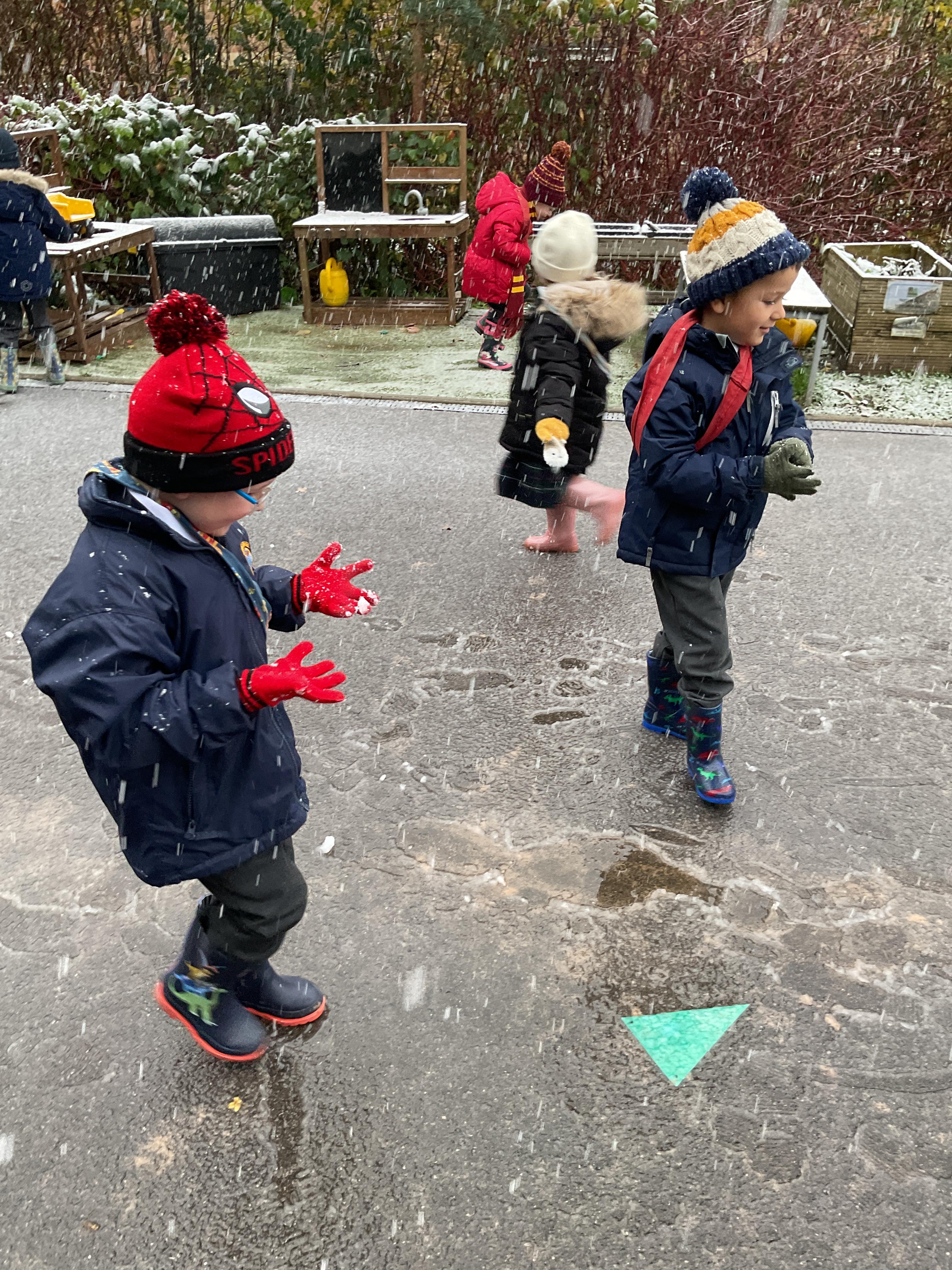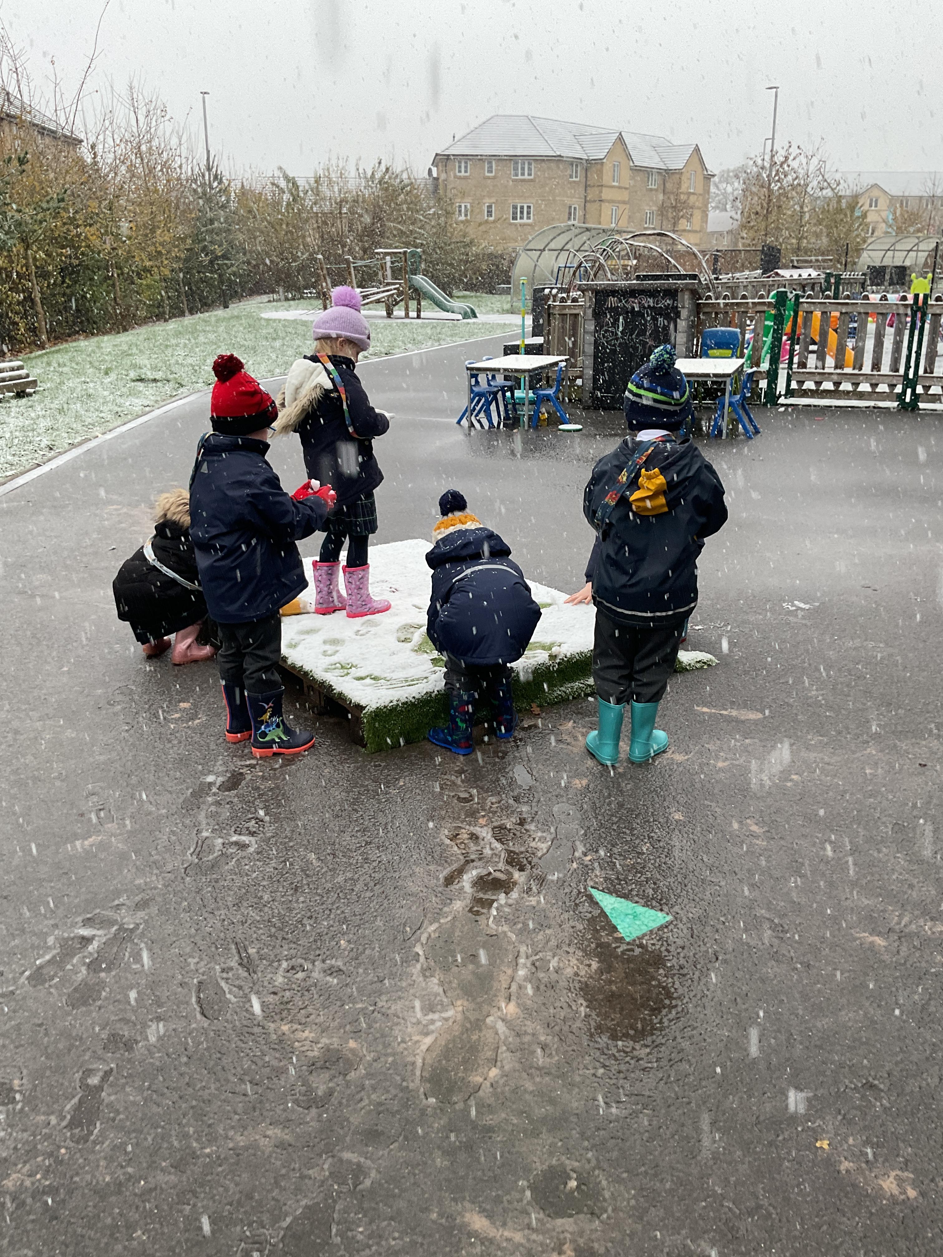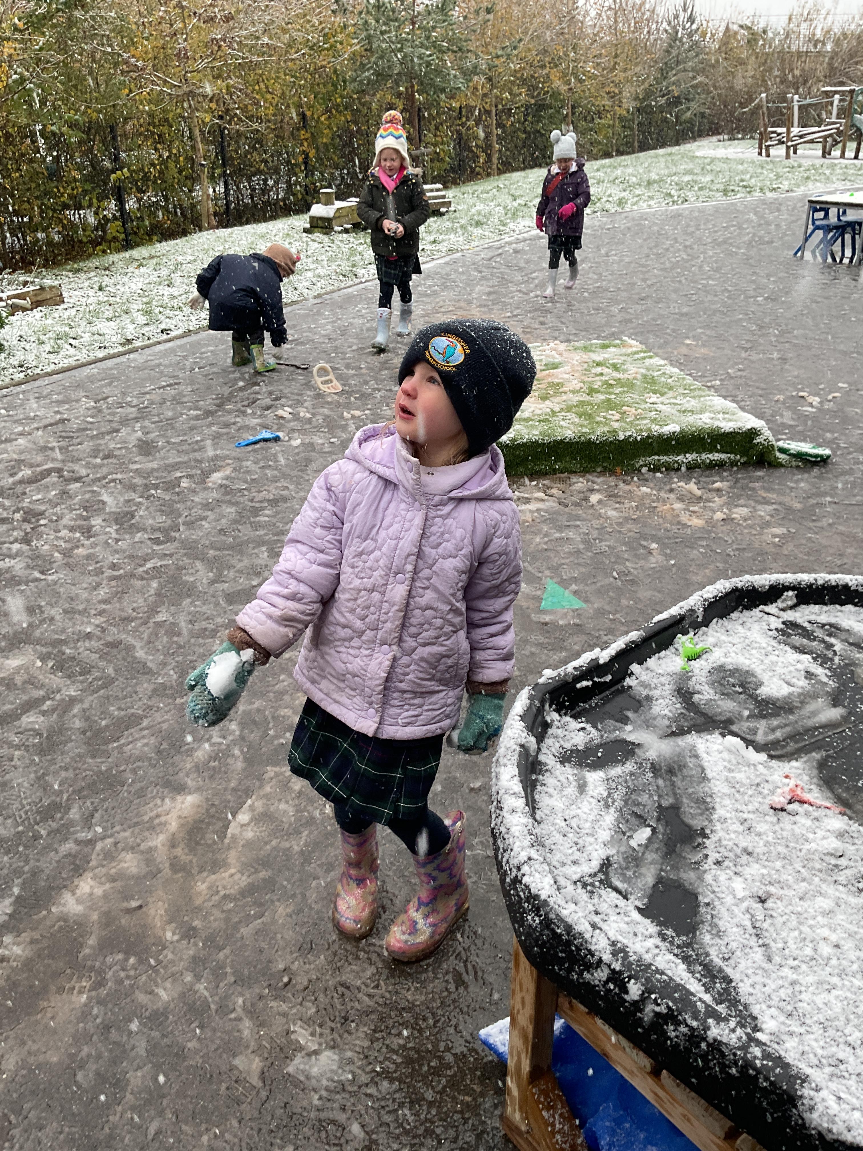 The children had a wonderful time playing in the snow. They enjoyed trying to catch the snowflakes, exploring the ice, making footprints and making snowballs. They then all went out on the playground to play with the rest of year one and two.
