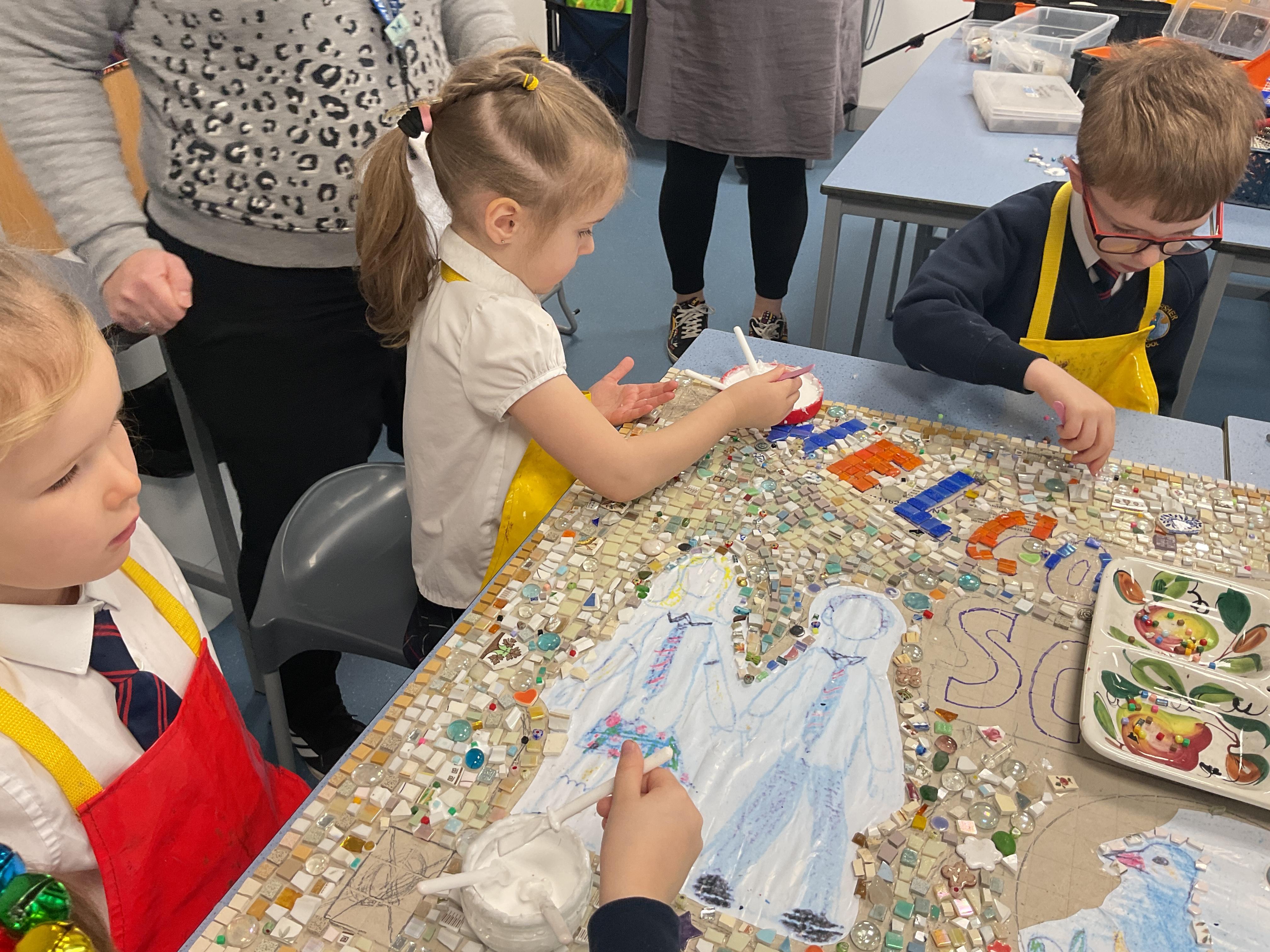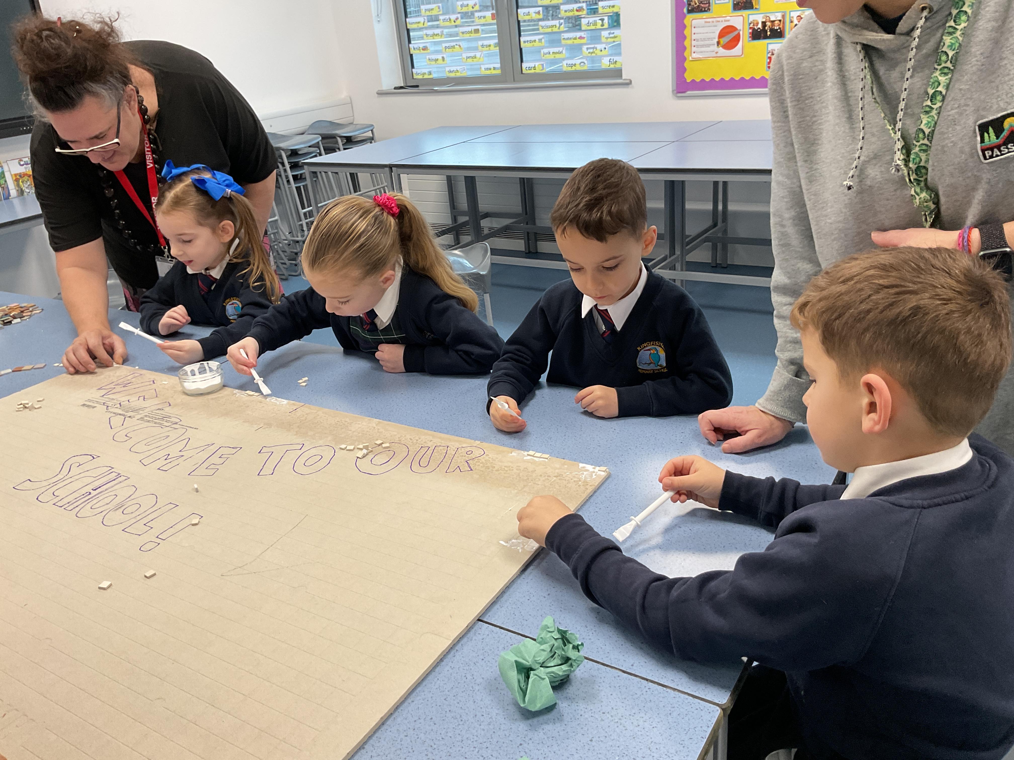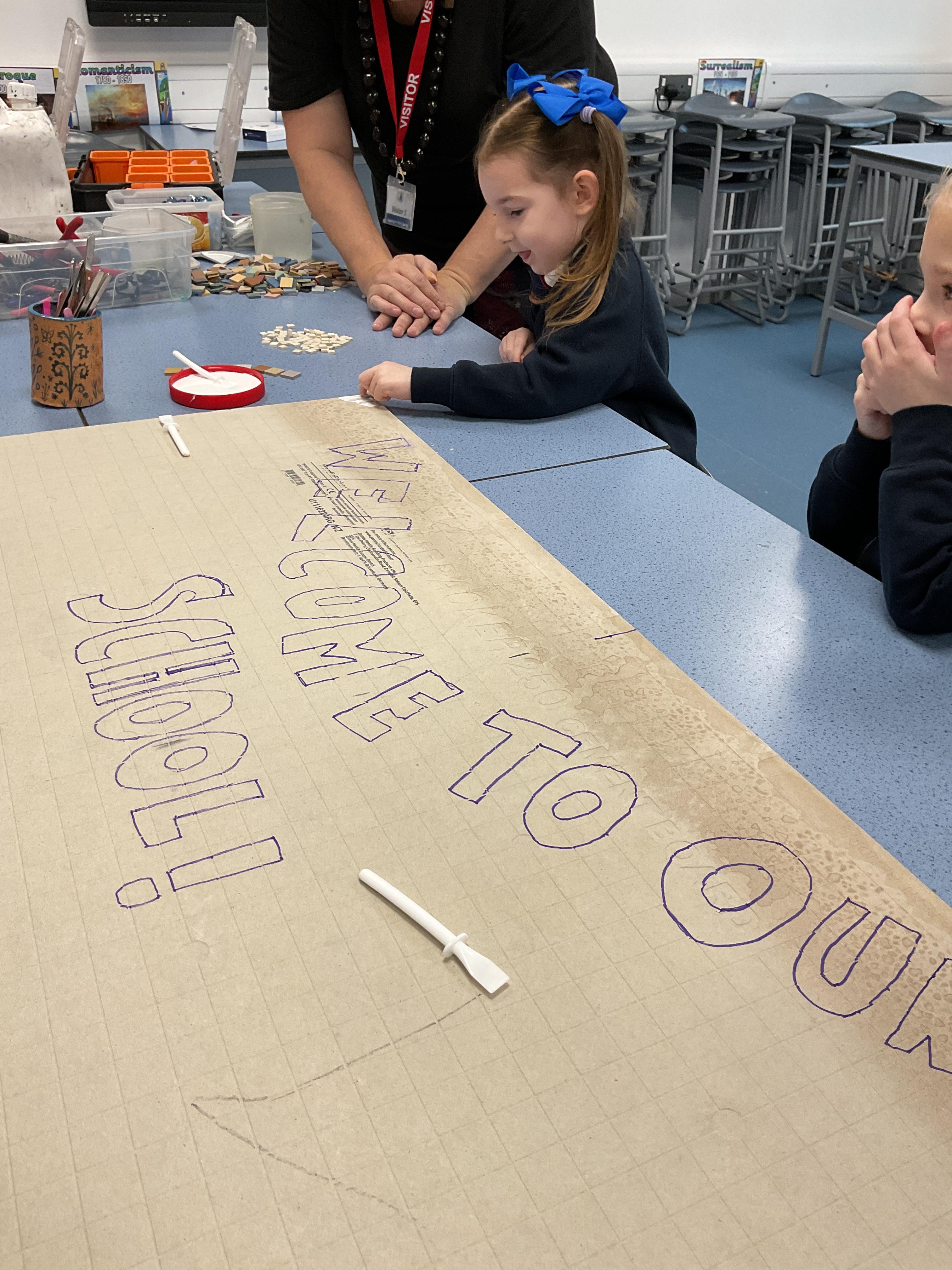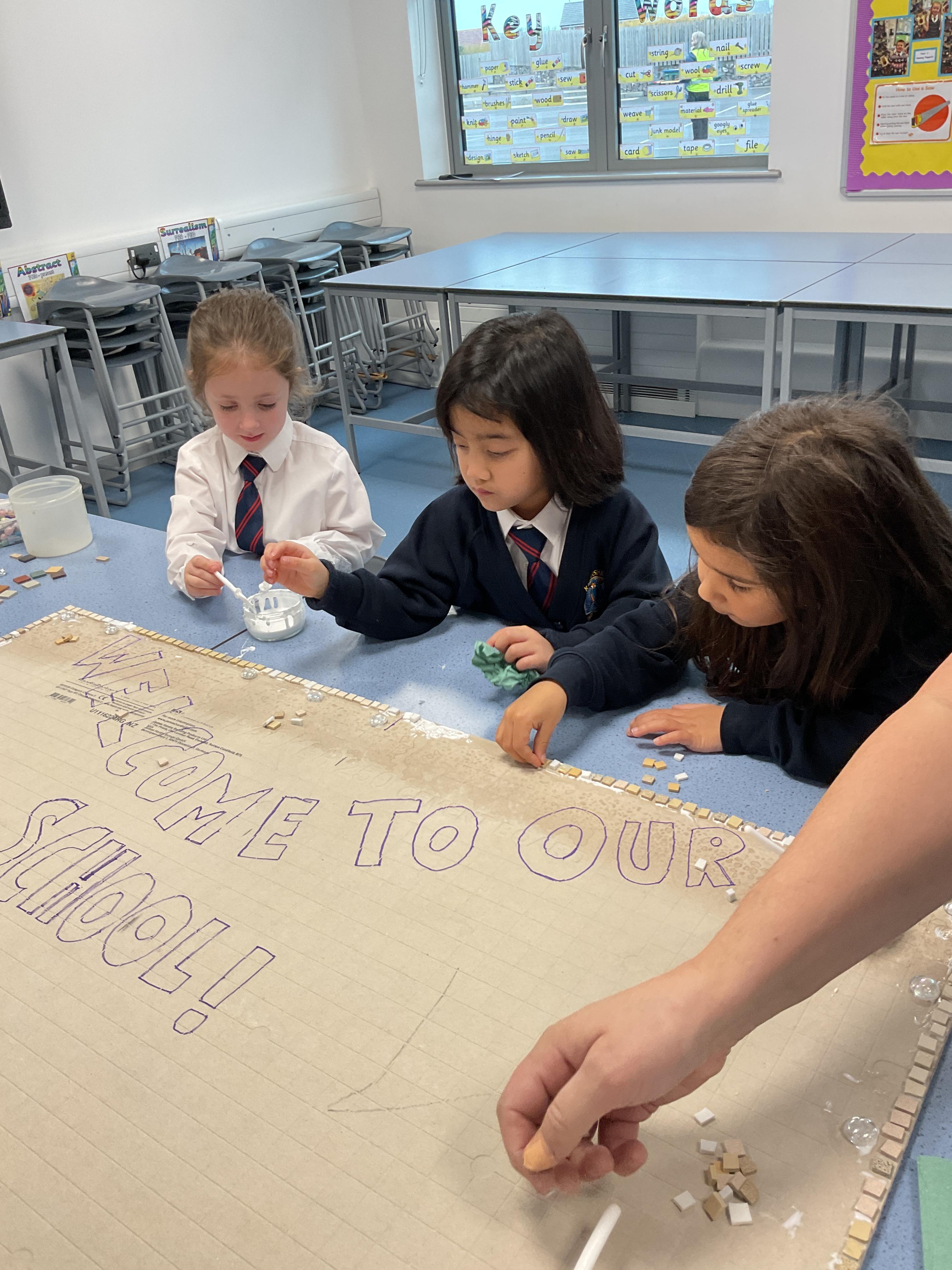 The children really enjoyed having the opportunity to take part in the mosaic workshop. Every child placed some pieces of mosaic into the schools new welcome sign.