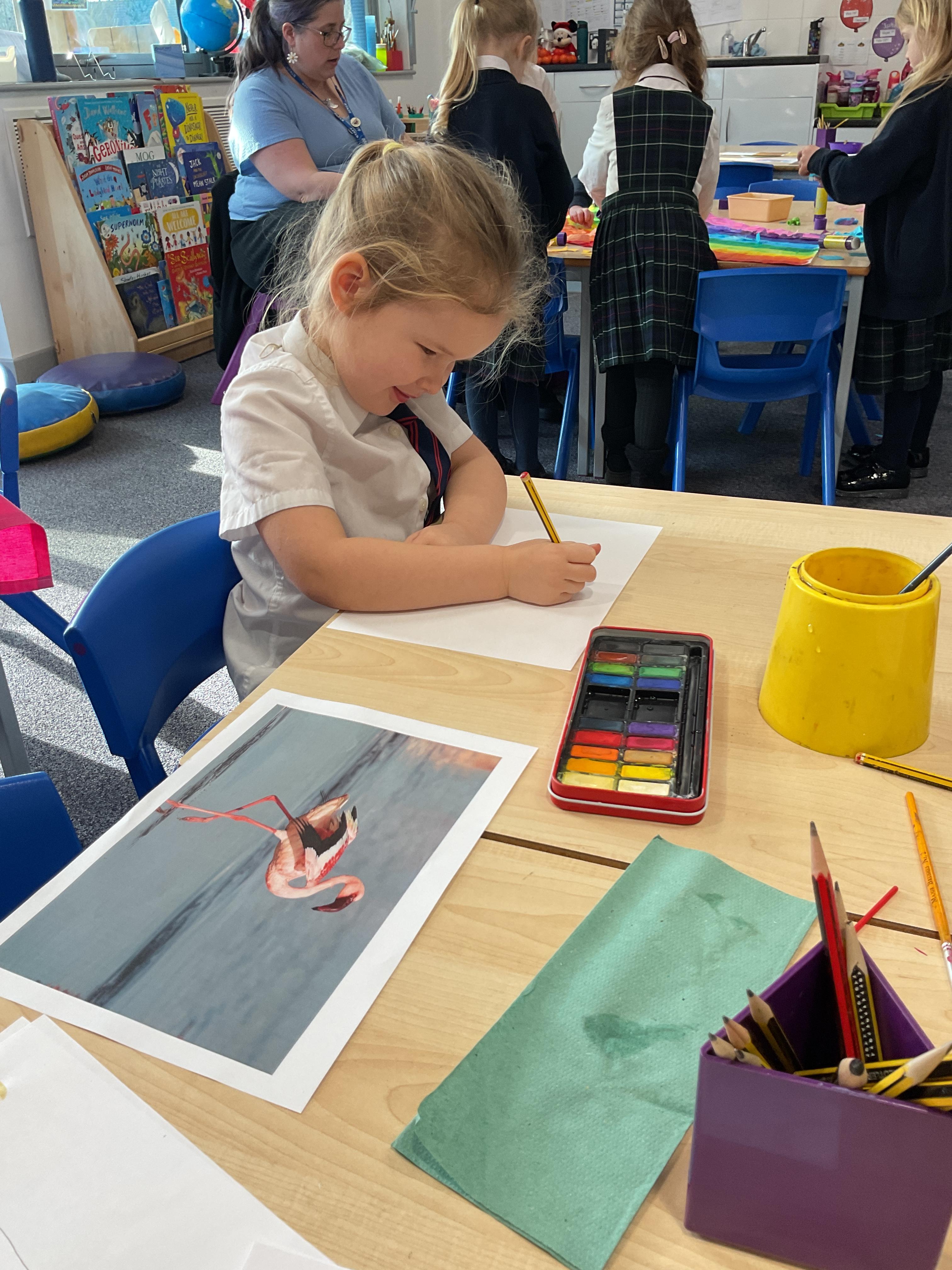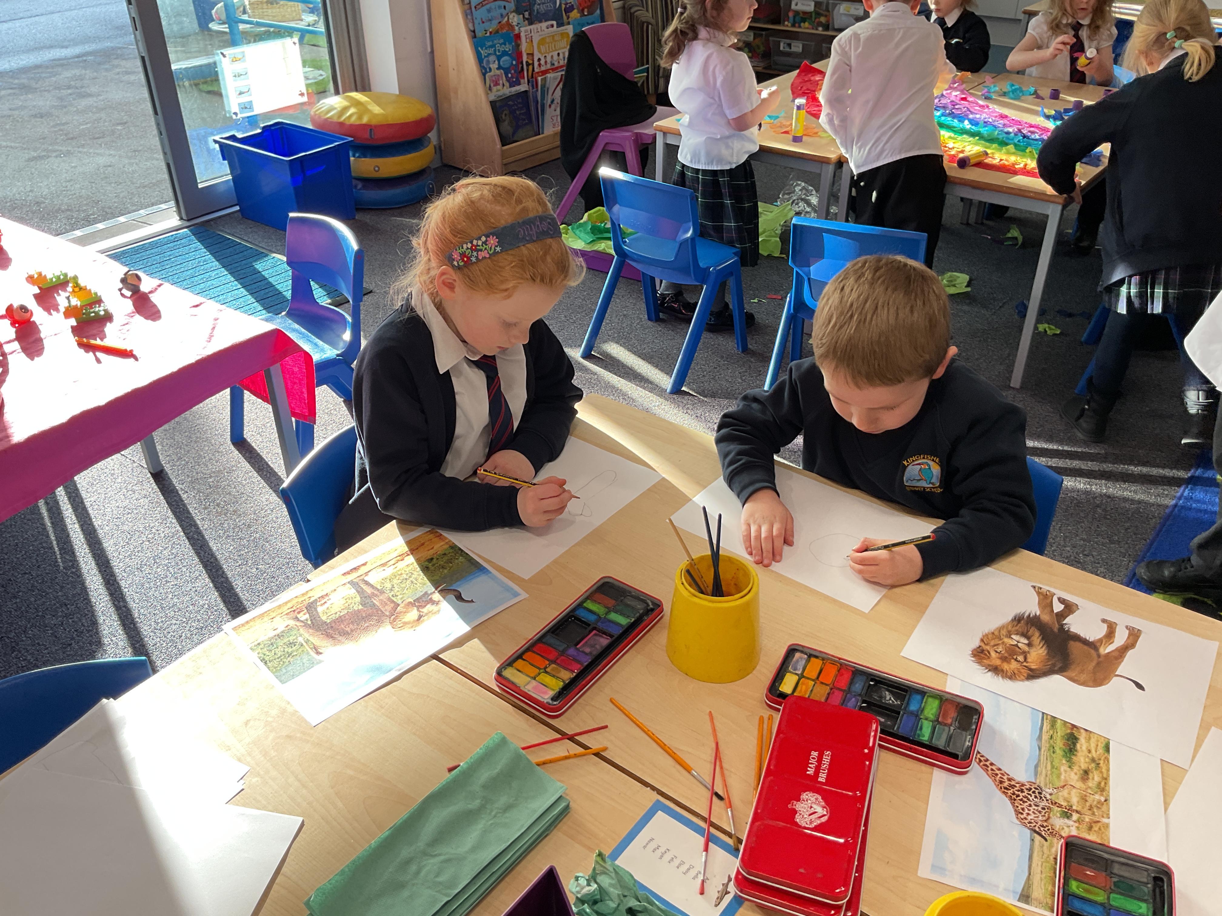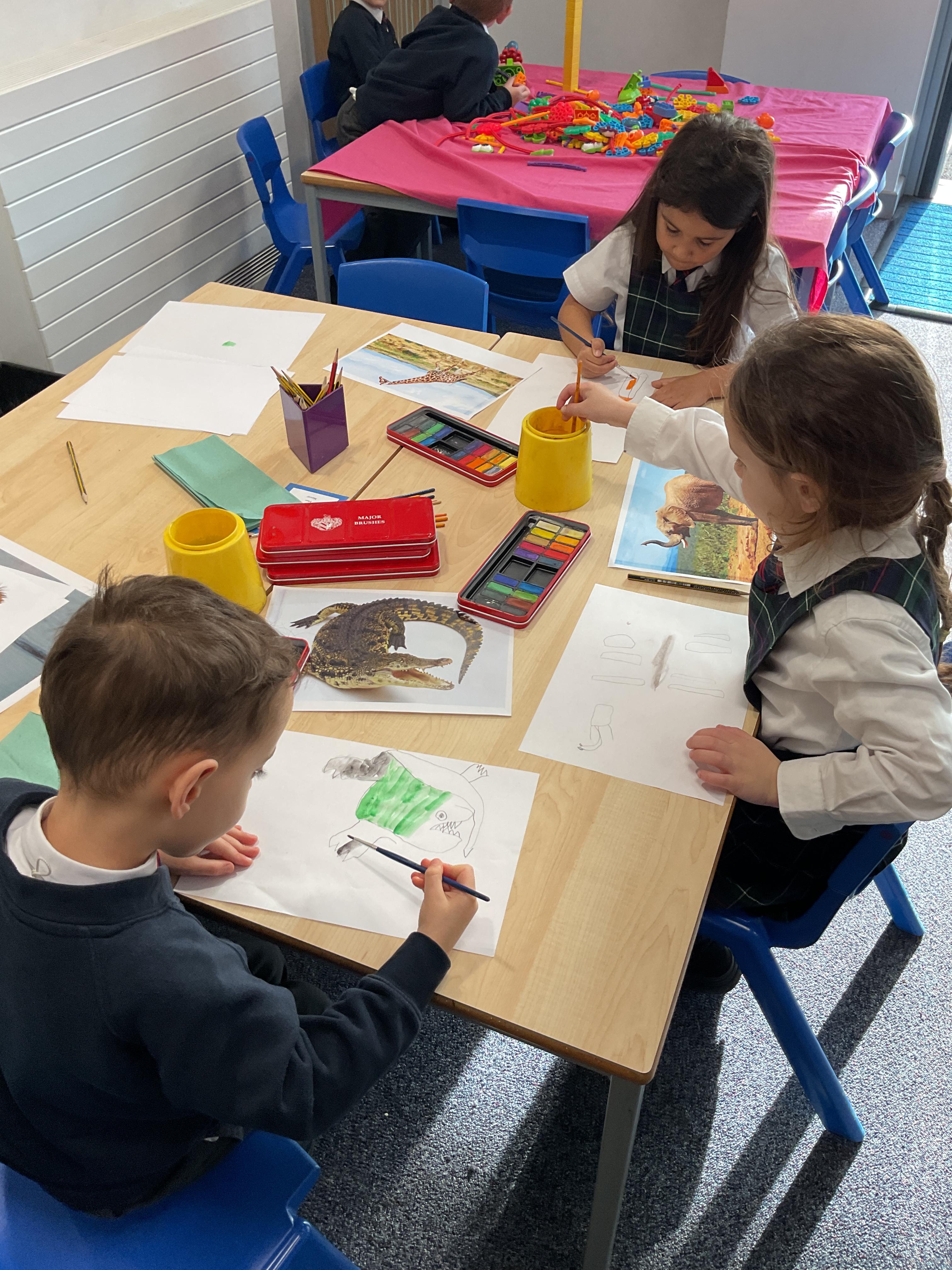 During our topic of Noah's Ark we enjoyed developing our observation drawing skills by drawing some animals for the display. We painted them with water colours and explored how these worked.