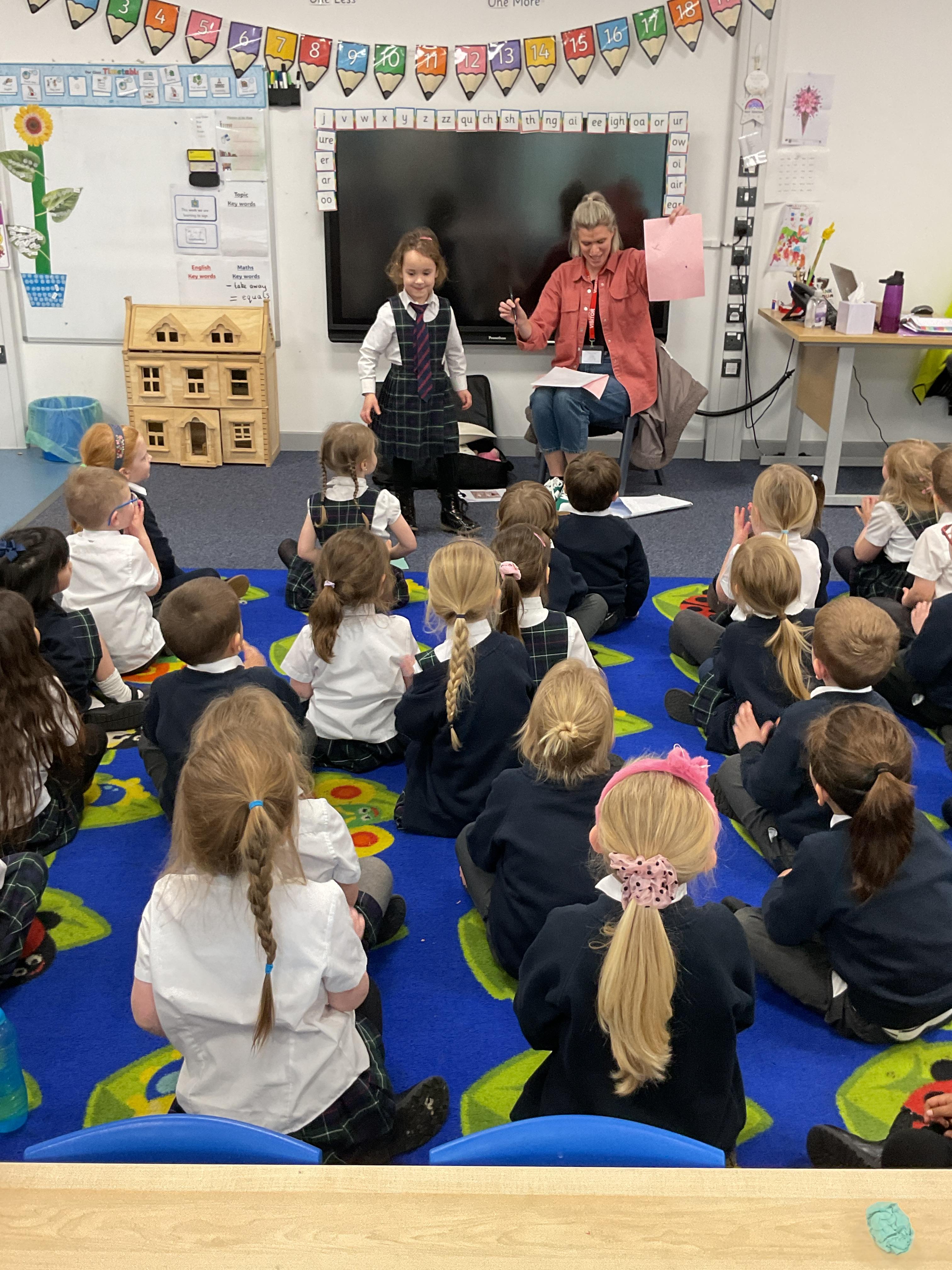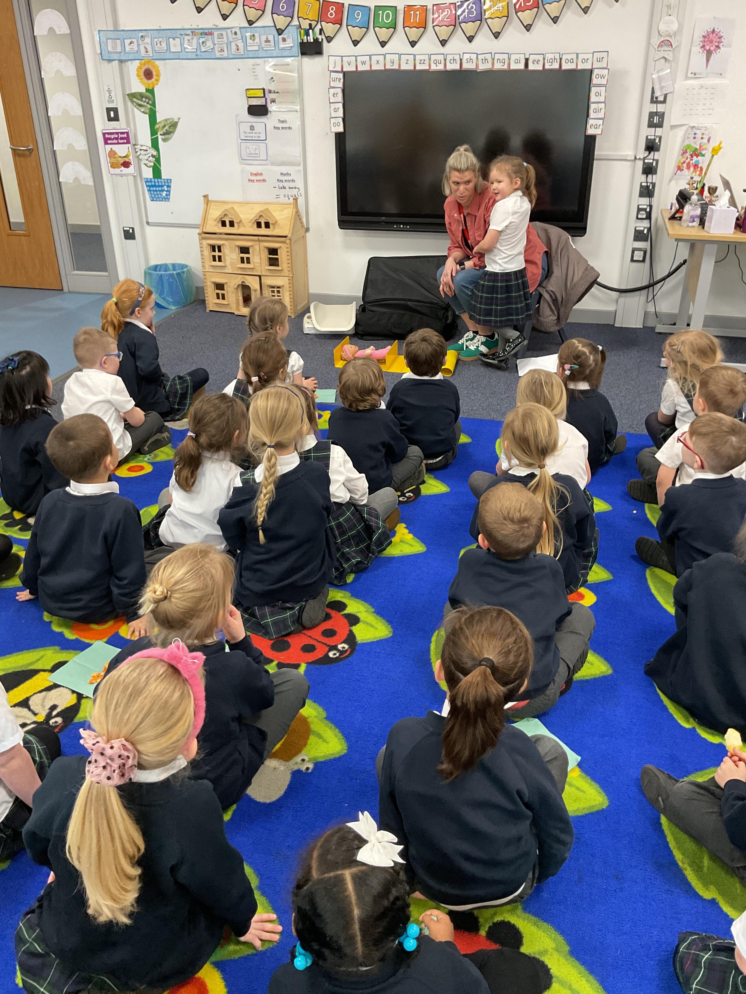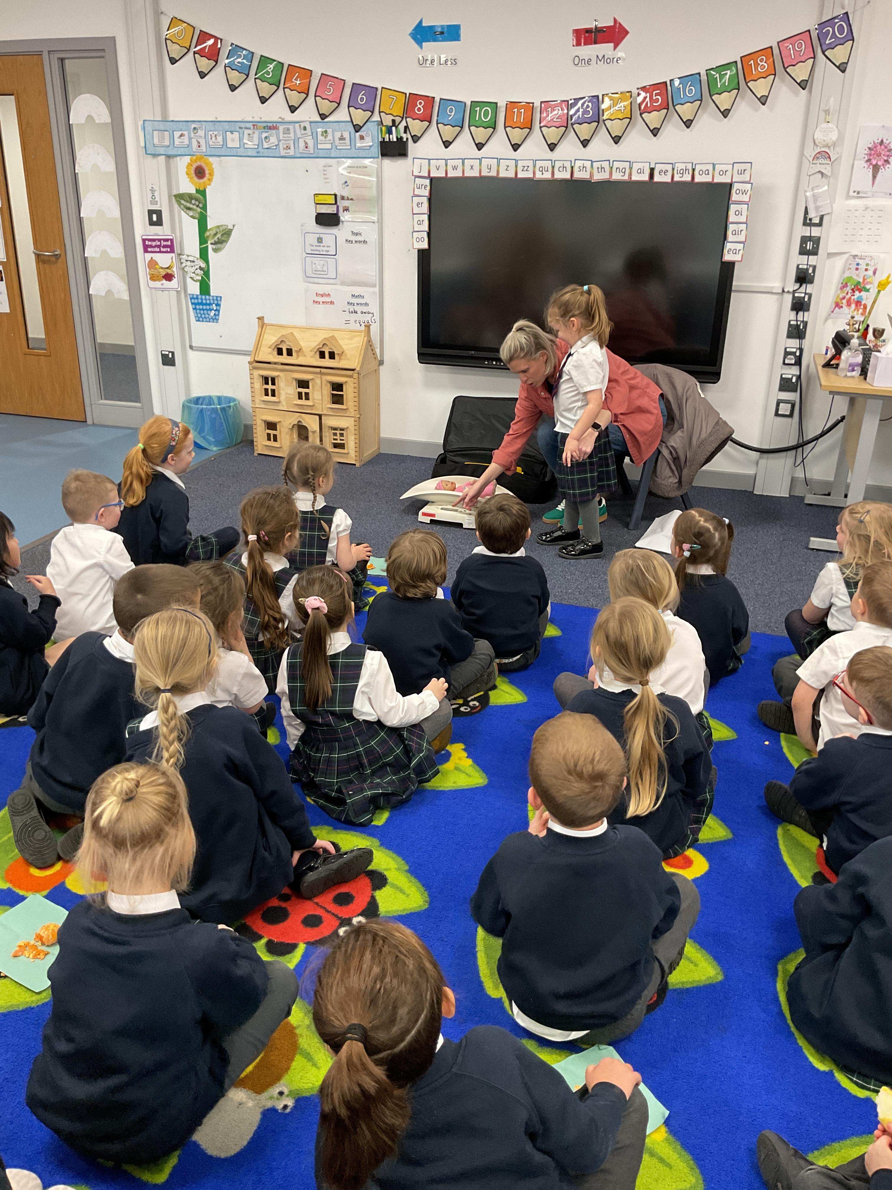 We were very lucky to have Mrs Chestnutt come into school and speak to us about her job as a health visitor. She showed us what she used to weigh and measure babies and talked to us about healthy foods, brushing our teeth and all the different things a 5 year old can do.
