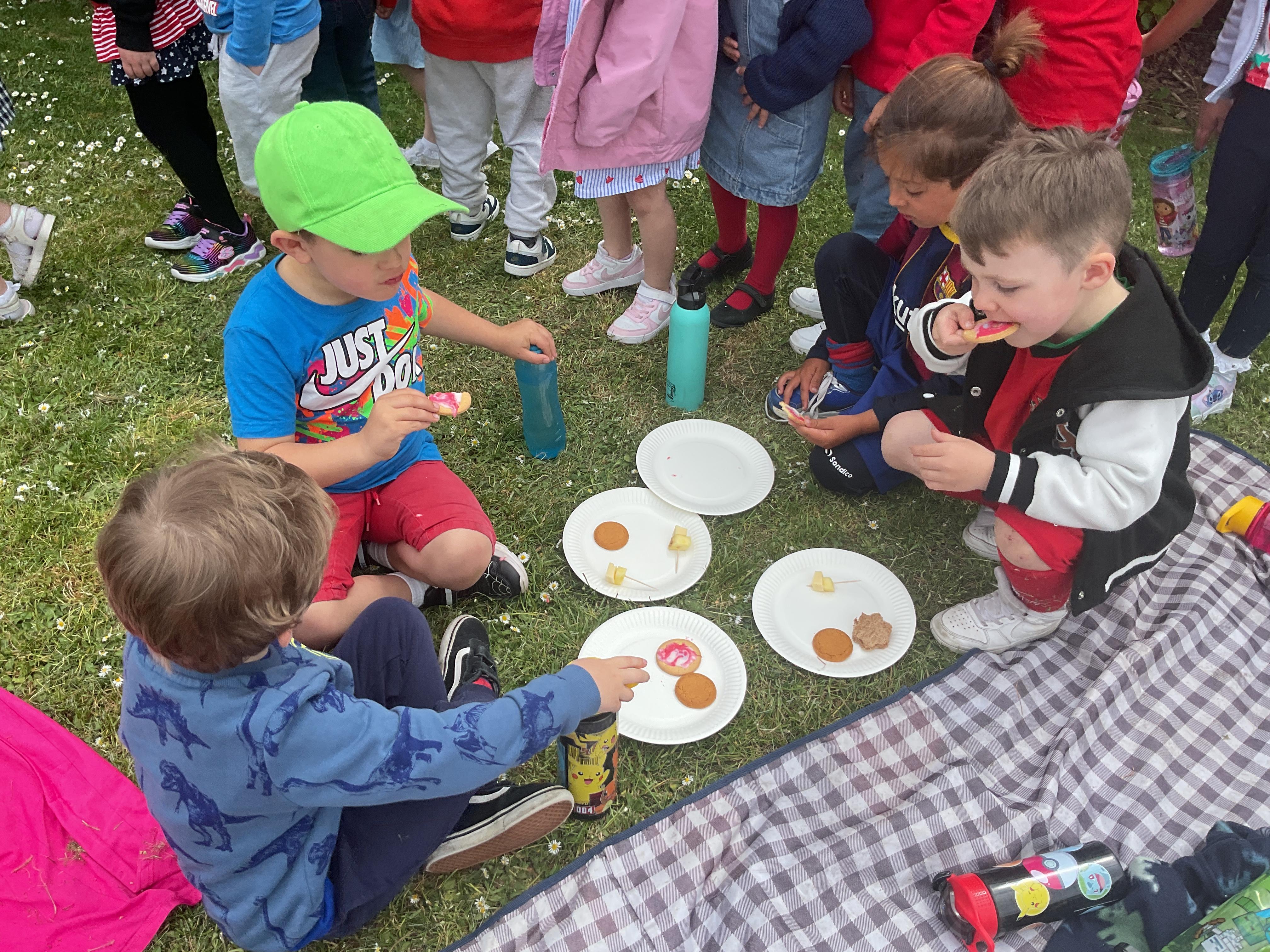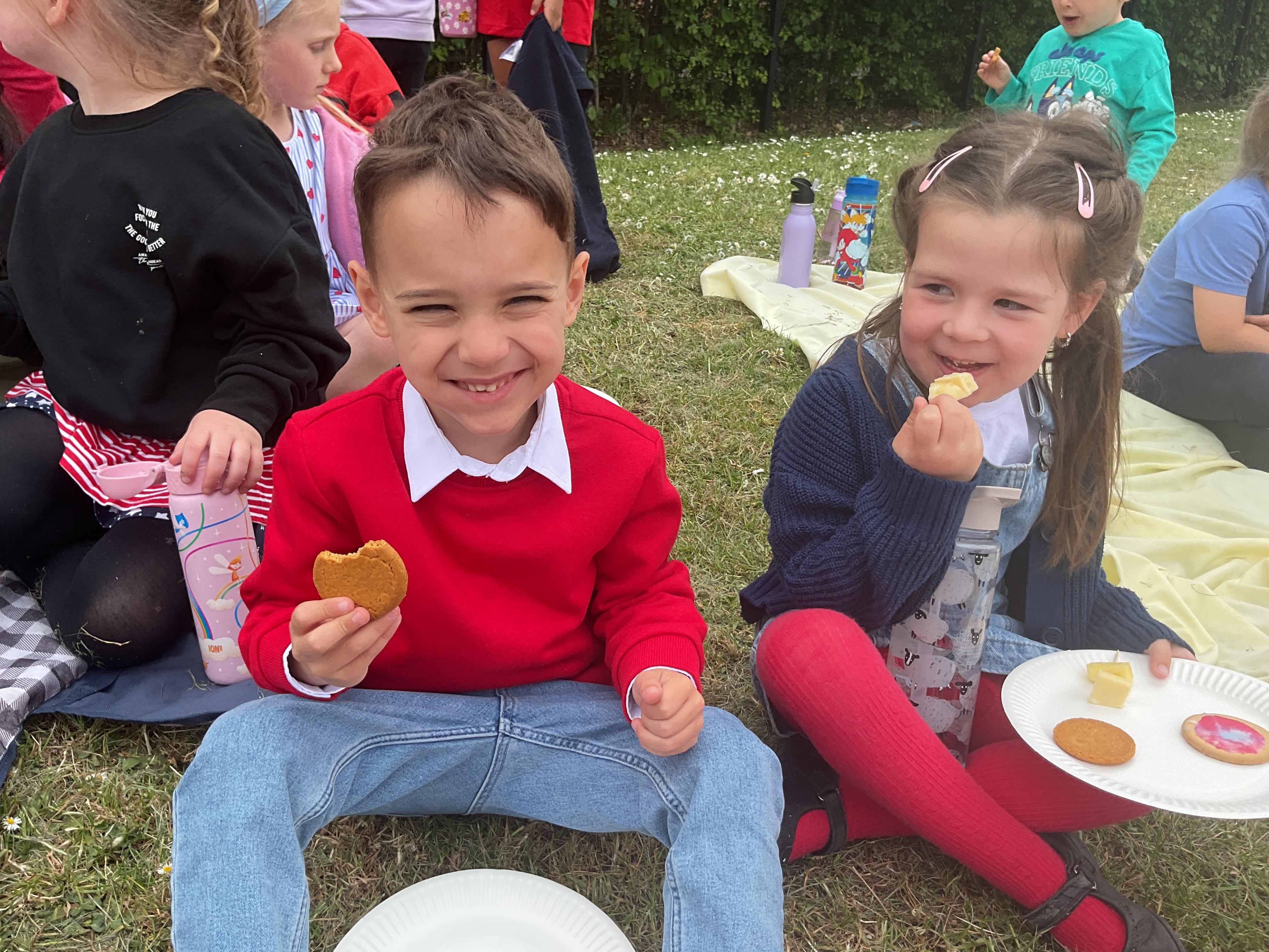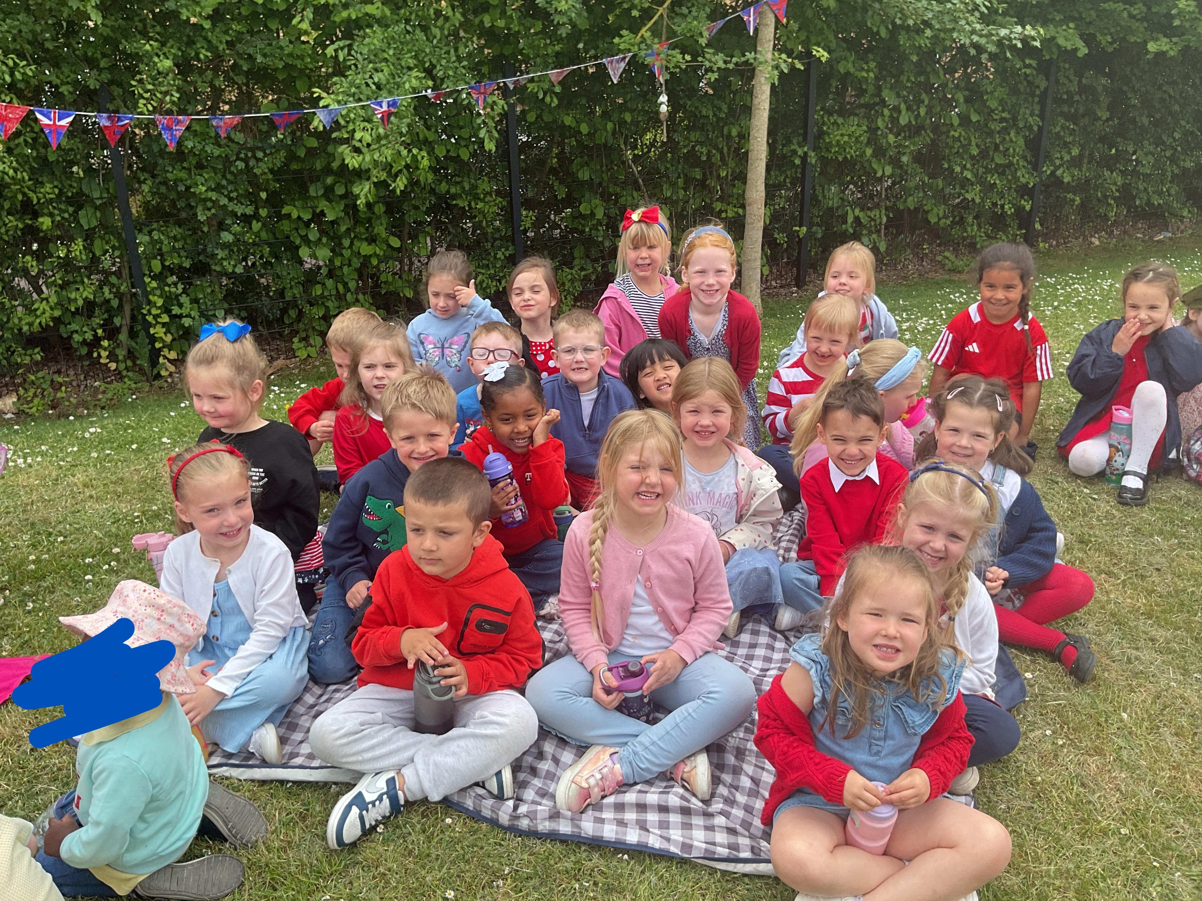 We had a lovely time celebrating VE Day. We started the day by making cheese and pineapple and flags for our tea party in the afternoon. We had a great party with the nursery children. We had lots of yummy food and played some traditional games such as hopscotch and hula hoop.