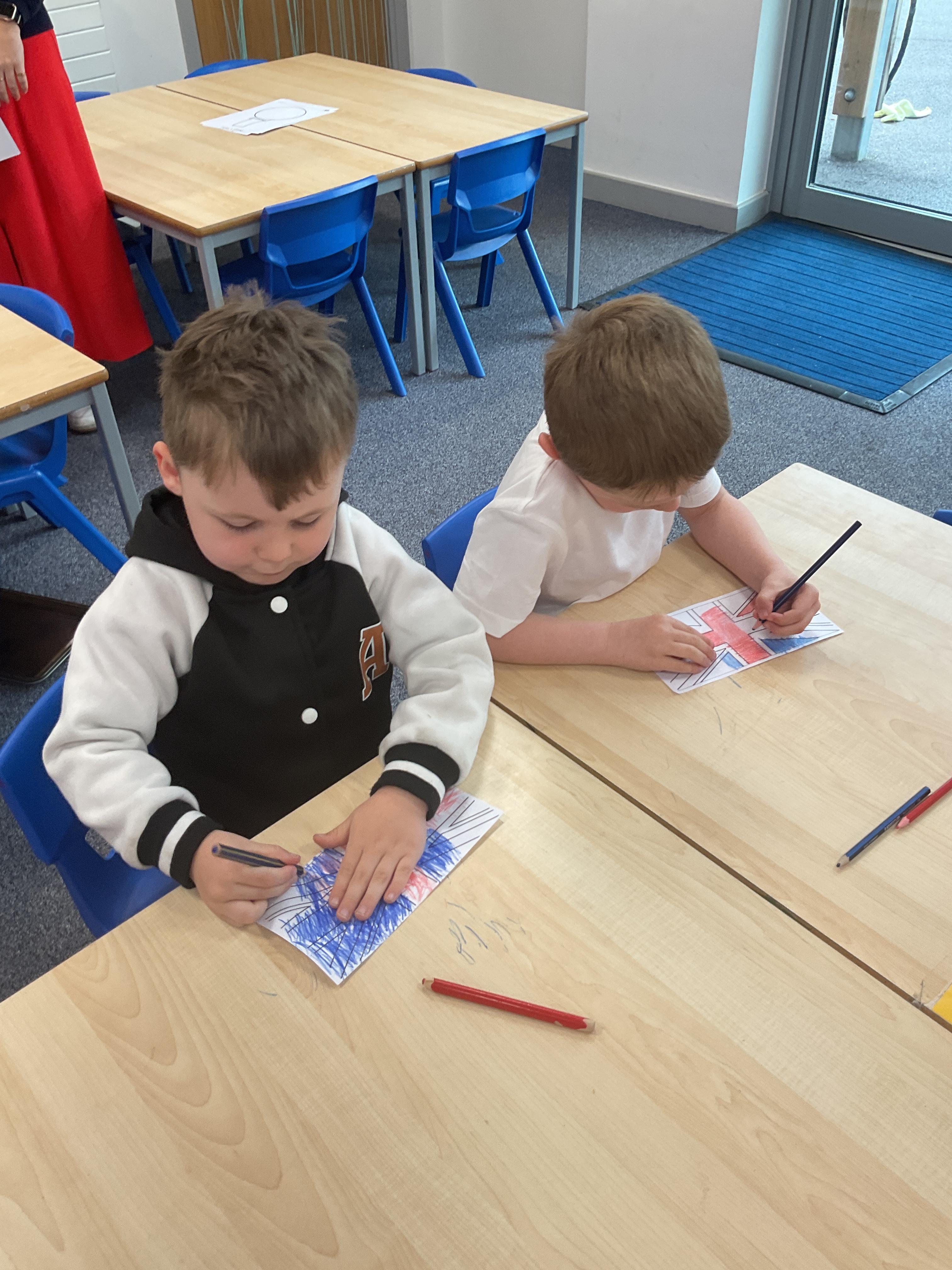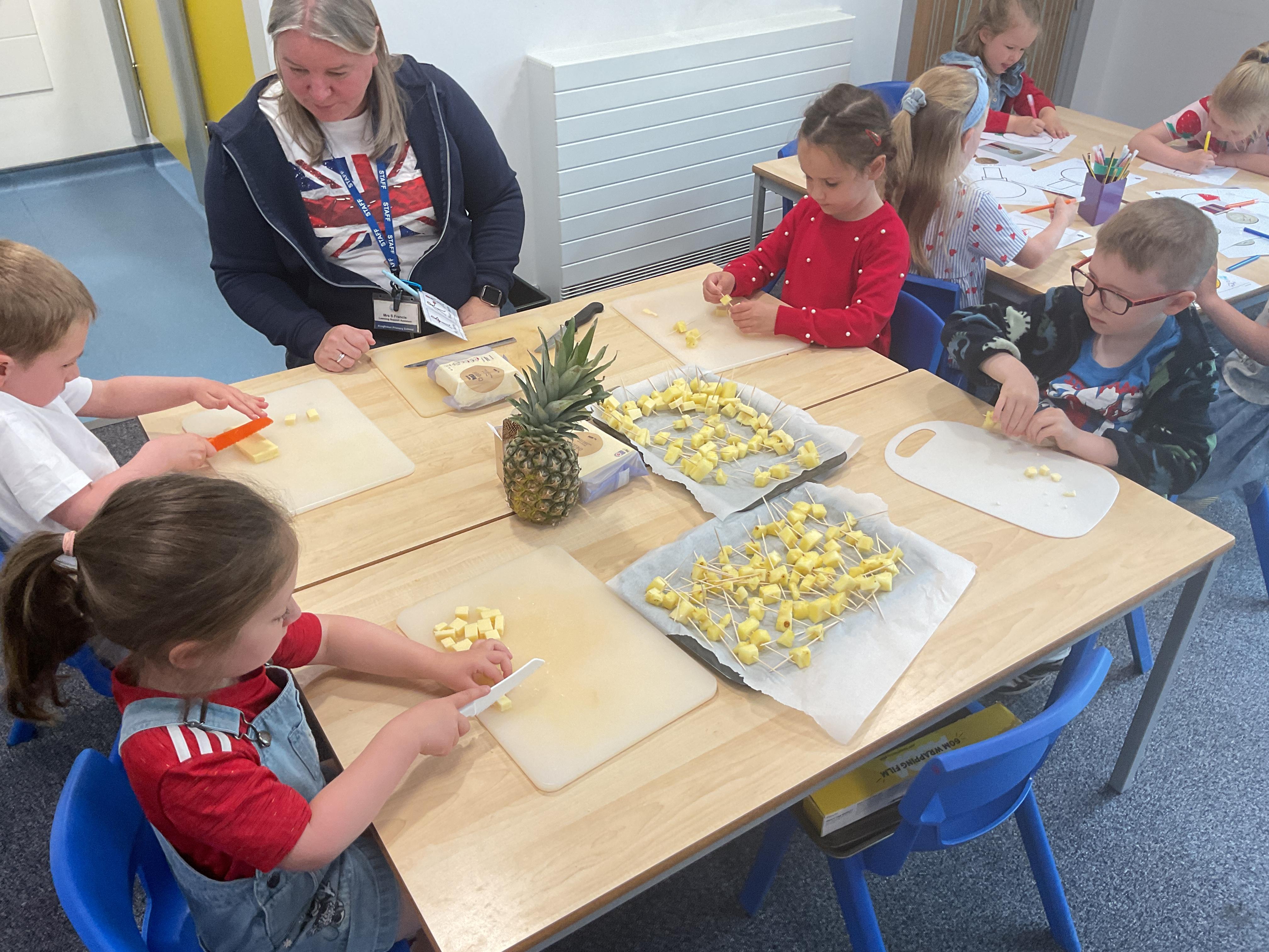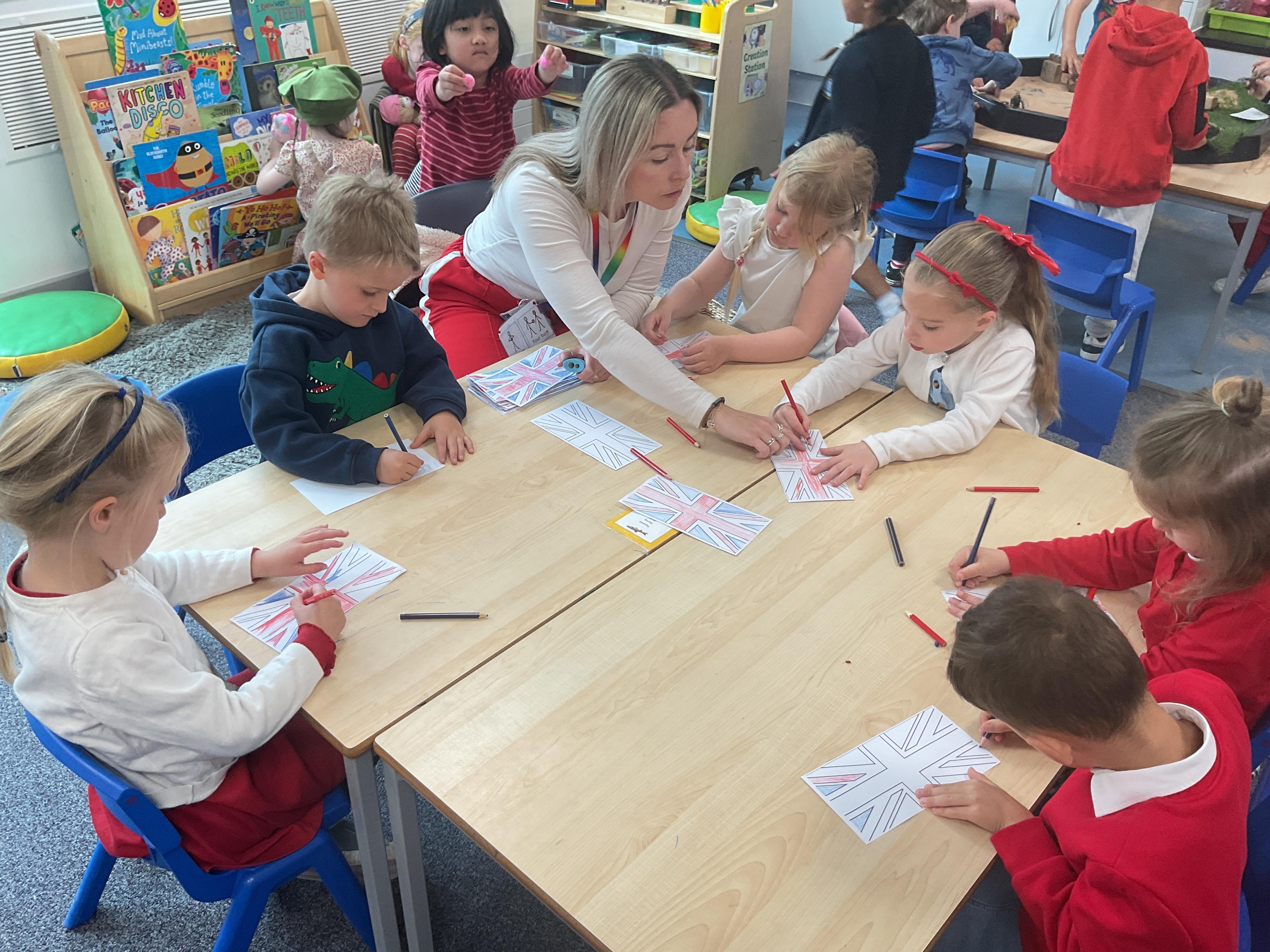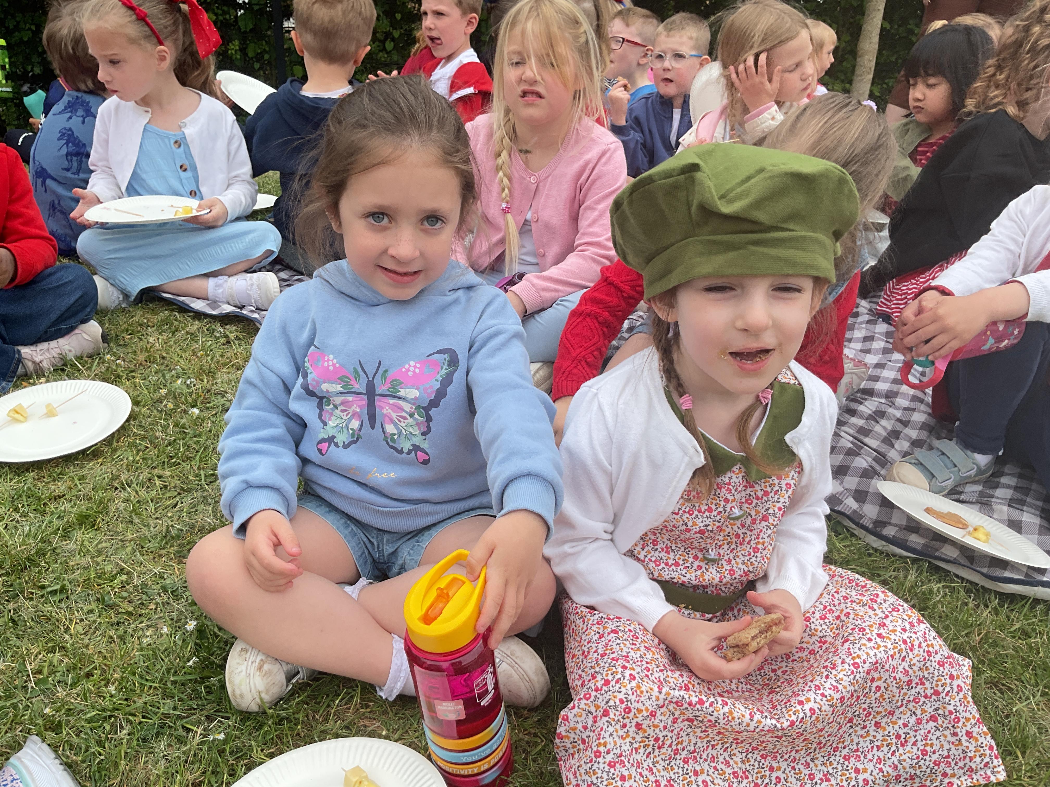 We had a lovely time celebrating VE Day. We started the day by making cheese and pineapple and flags for our tea party in the afternoon. We had a great party with the nursery children. We had lots of yummy food and played some traditional games such as hopscotch and hula hoop.