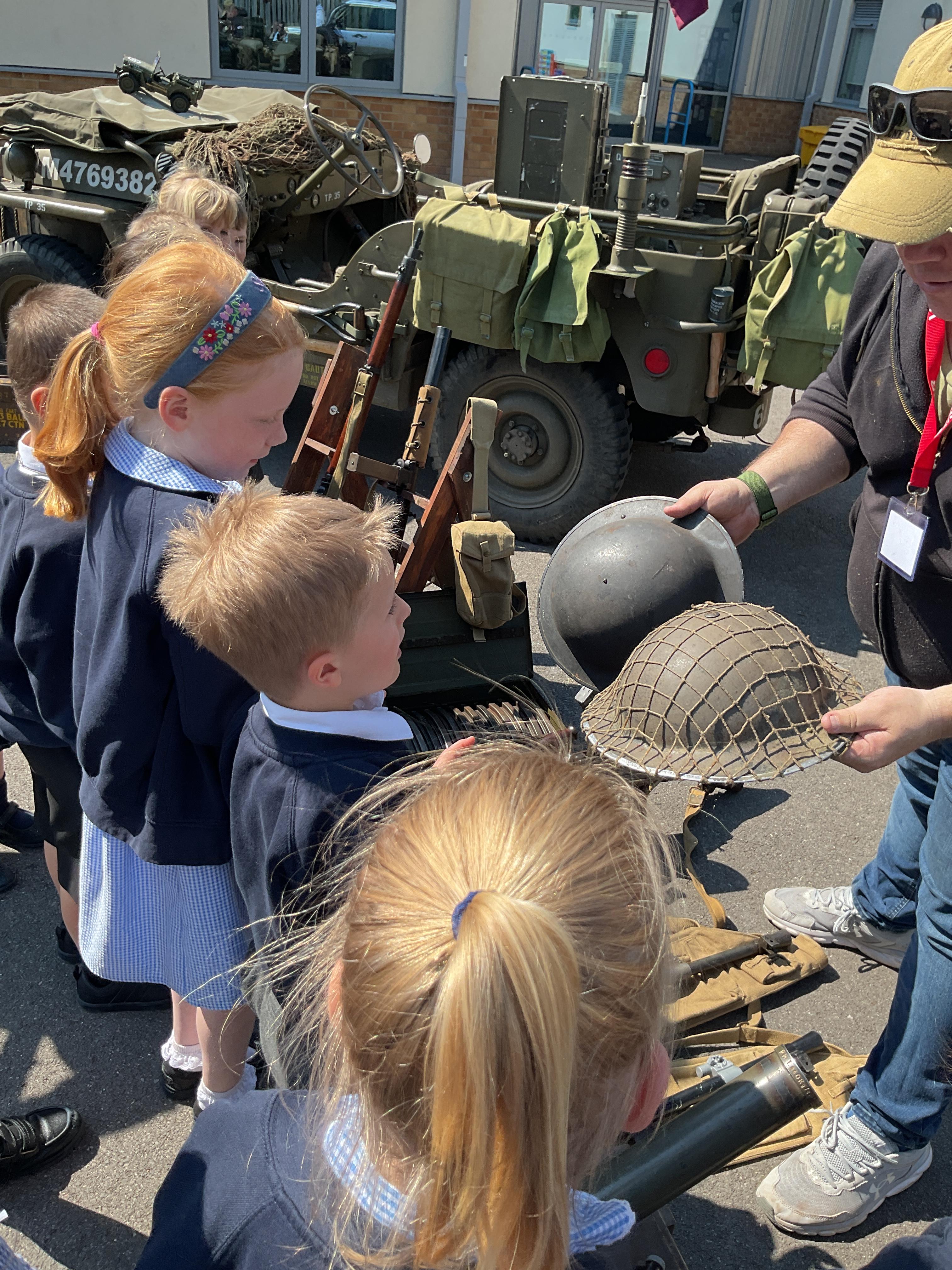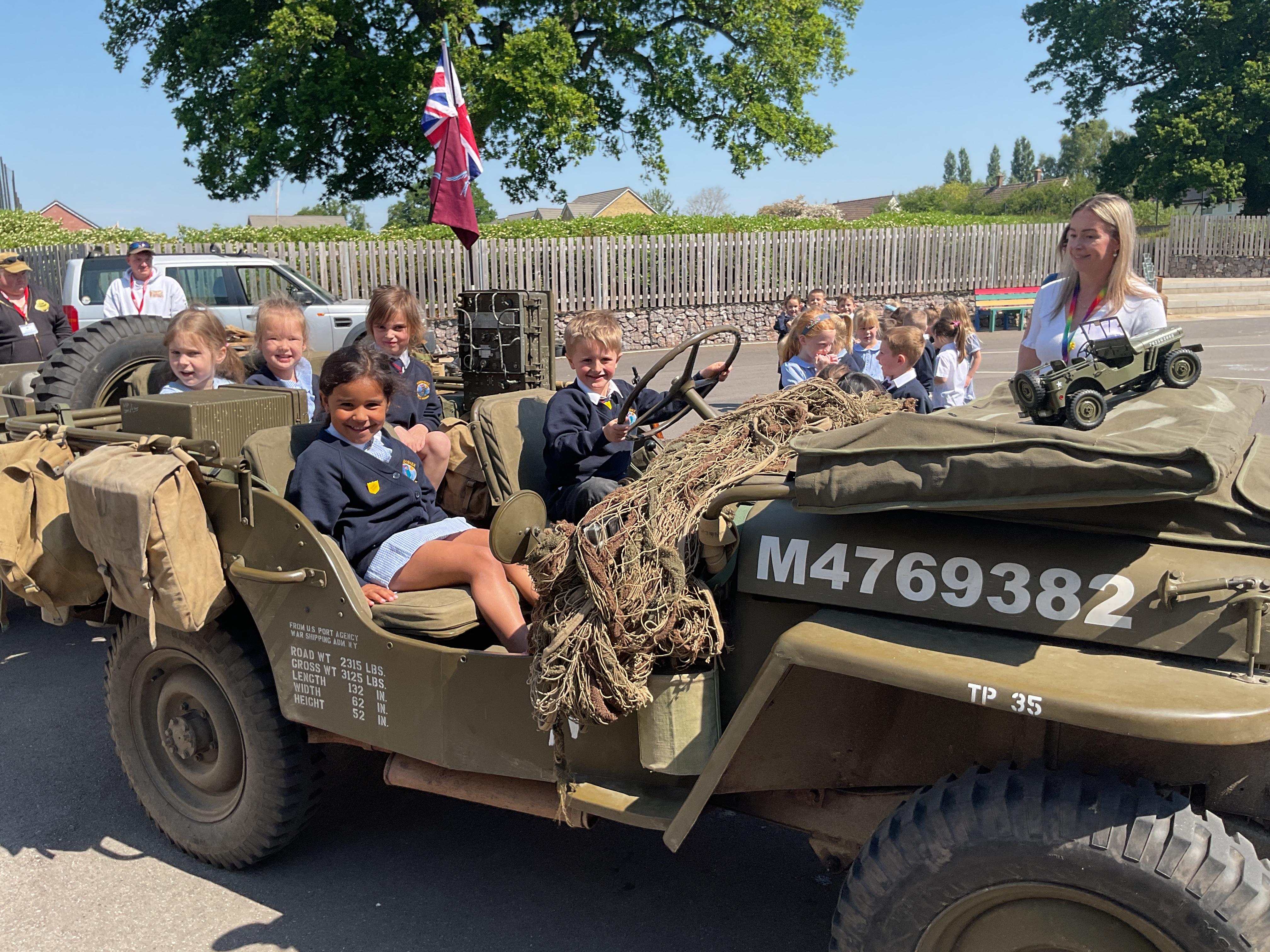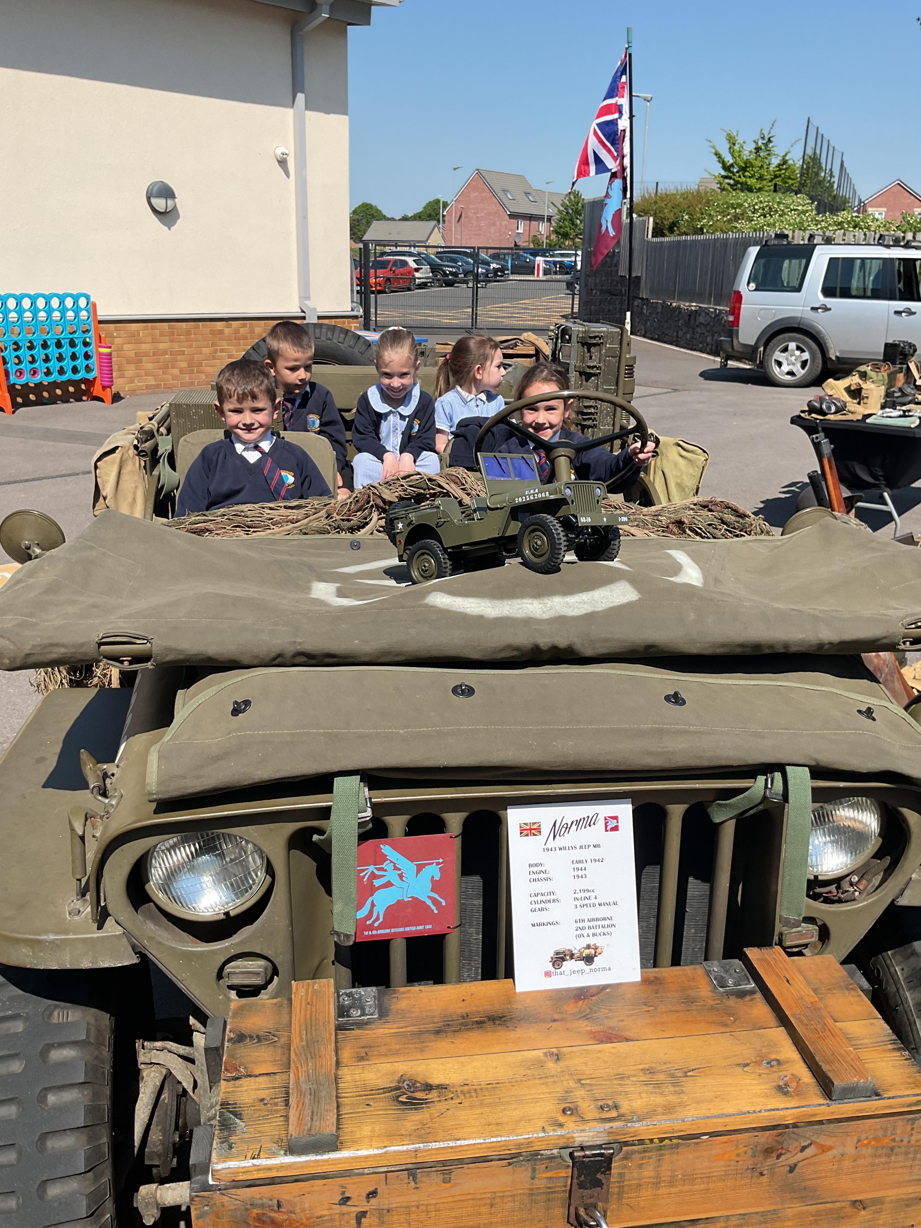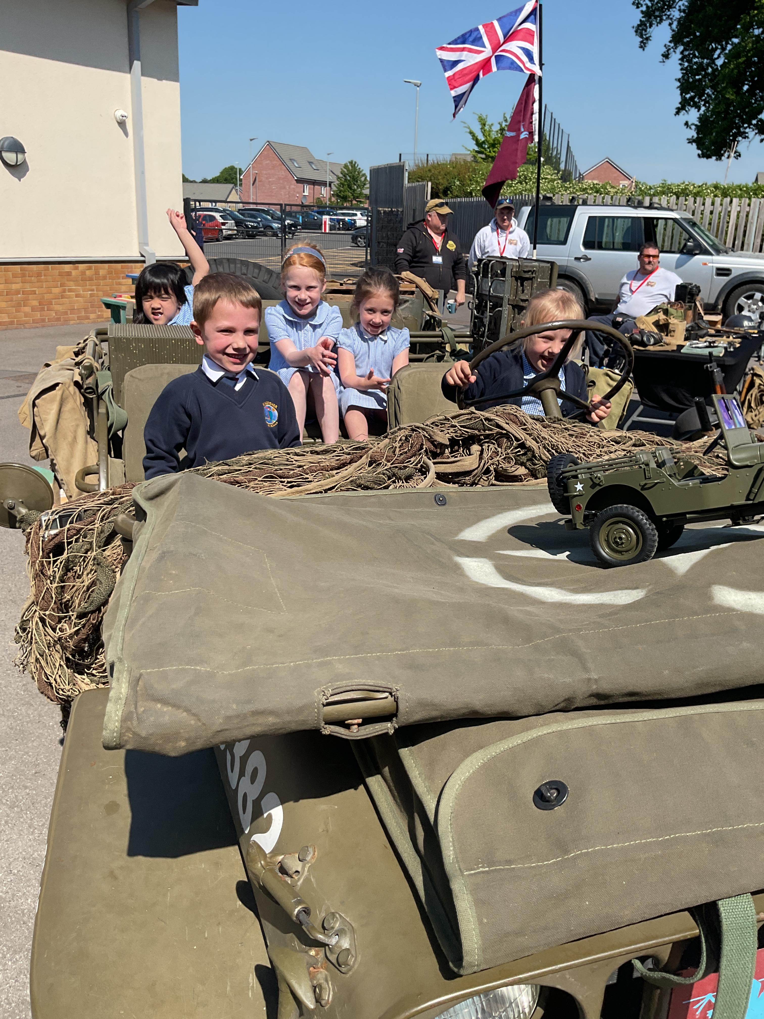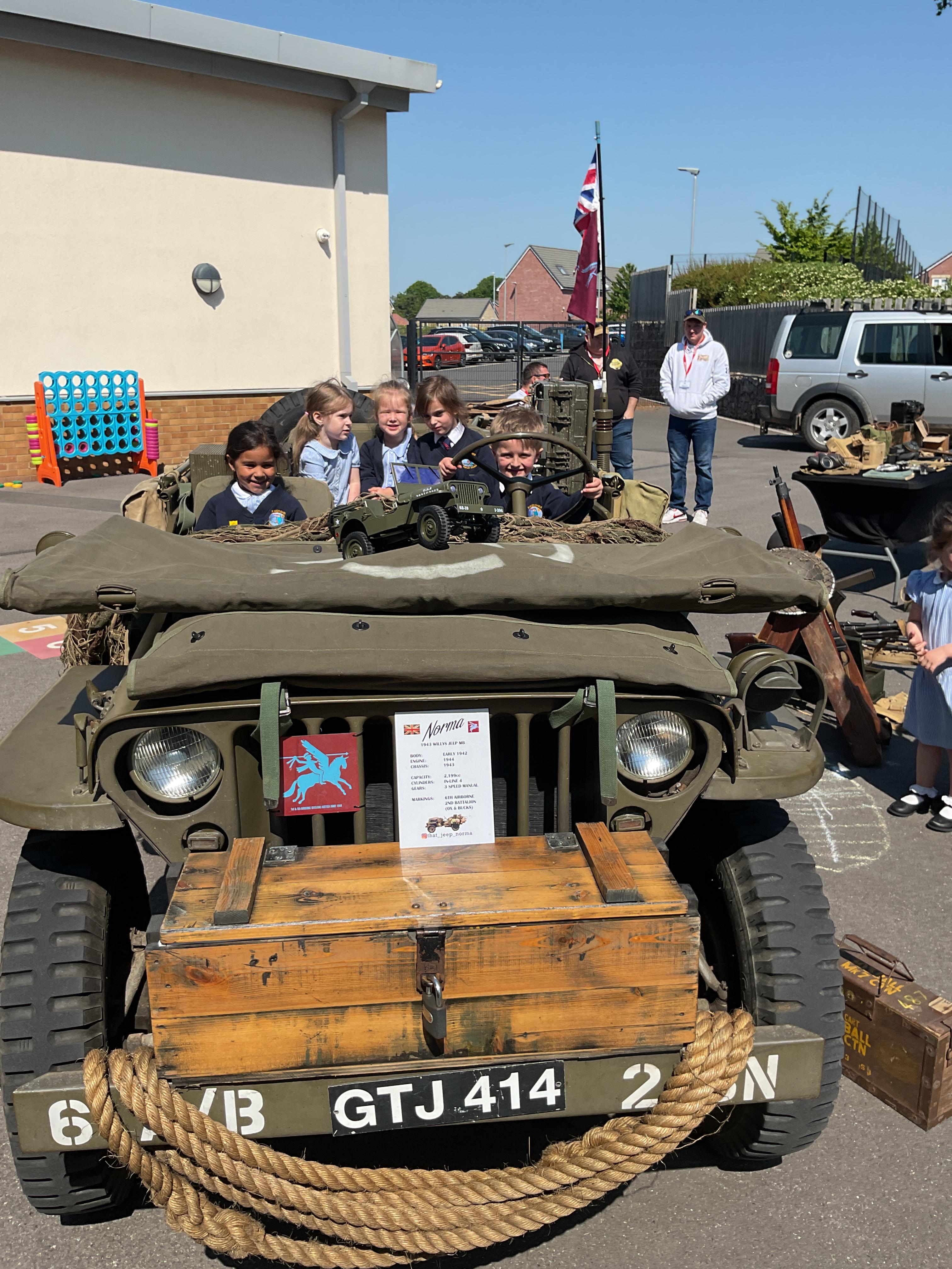 On the Friday after VE Day Mr Glentworth organised for some military vehicles to come into school to round off the  celebrations. We had a great time exploring all of the different artefacts they brought in and even got to have a turn in the jeep.